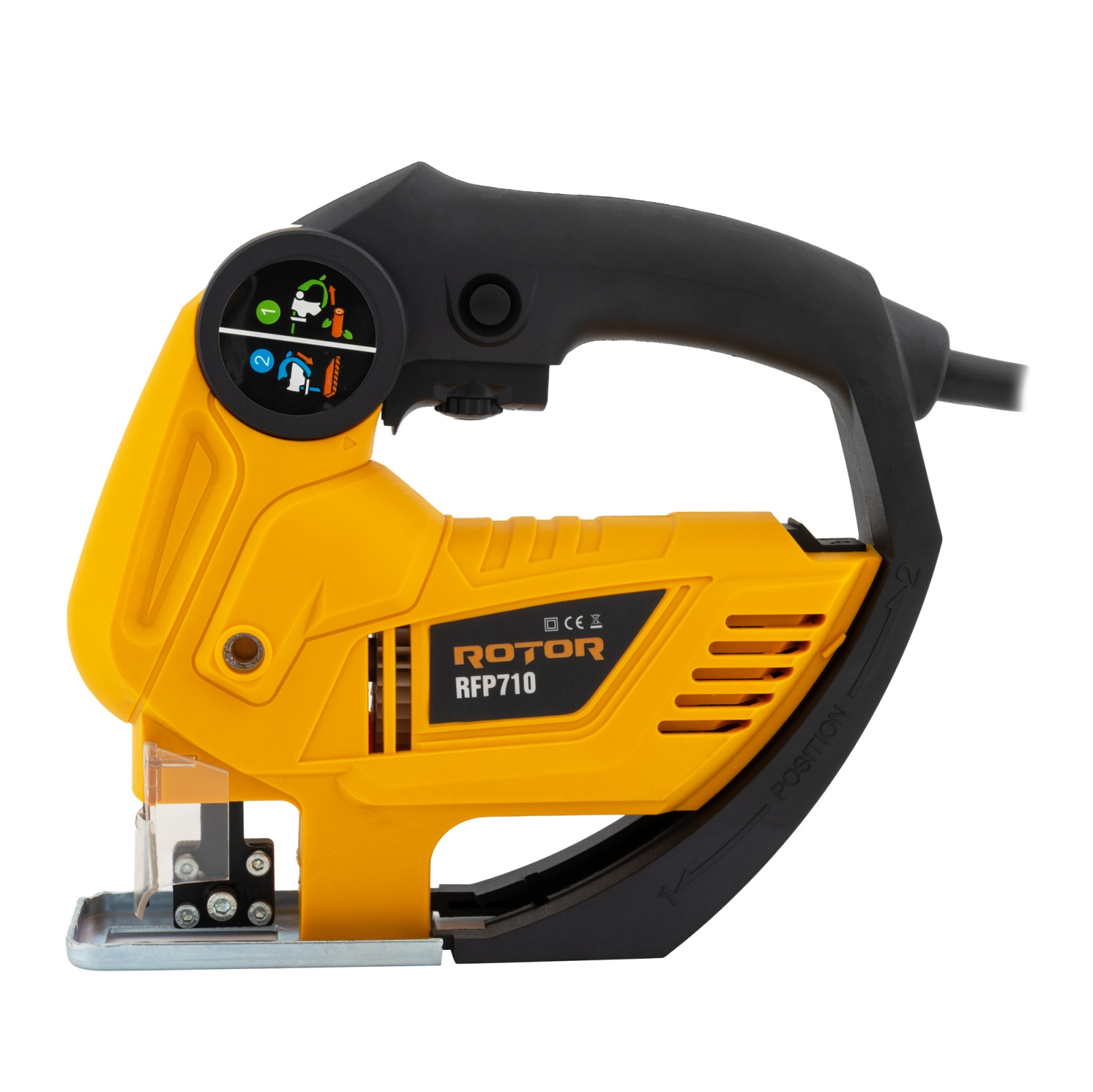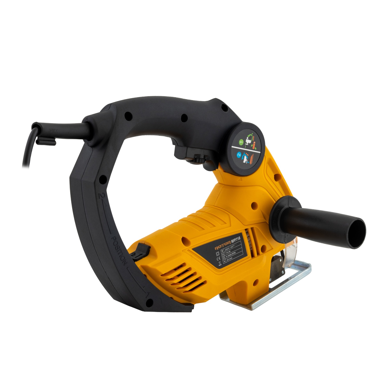 Fierastrau pendular fierastrau tip sabie 2in1 ROTOR RFP710 Ai nevoie de un fierăstrău versatil, care să facă atât tăieturi fine în lemn, cât și lucrări mai dure, precum debitarea de țevi sau panouri groase? ROTOR RFP710 îmbină două funcții esențiale într-un singur aparat: fierăstrău pendular și fierăstrău tip sabie, comutabil printr-o simplă rotire a cadrului semicircular. Acest sistem inteligent „Position 1/2” îți permite să treci instant între tăiere fină (mod pendulare) și tăiere agresivă/demolare (mod sabie), economisind spațiu în trusă și bani pe două scule separate. Cu un motor de 710 W, RFP710 menține cuplu constant chiar și în lemn dur sau PAL melaminat. Turația variabilă până la 3.000 rpm și pendularea pe niveluri îți oferă control și eficiență în funcție de material – de la curbe delicate în MDF, până la secționări rapide în țevi PVC sau profile metalice. Talpa pivotantă, plăcuța anti-așchii și LED-ul frontal garantează tăieri curate și vizibilitate optimă, iar prinderea T-Shank permite schimbarea rapidă a pânzelor, fără chei sau scule suplimentare. Conectarea la aspirator Ø35 mm menține zona de lucru curată și prelungește viața pânzei, iar designul cauciucat și echilibrat reduce vibrațiile și îți permite să lucrezi inclusiv deasupra capului, cu mai puțin efort. Caracteristici tehnice: - Tensiune alimentare: 220 V/ 50 Hz - Puterea de intrare: 710 W - Turație variabilă în gol: 0- 3000 rpm (rotiță reglaj) - Capacitate tăiere lemn: 65 mm - Capacitate tăiere oțel / PVC: 6 / 8 mm - Tip prindere pânză: T-Shank Conținut pachet: - Fierăstrău ROTOR RFP710 710 W - 2 × pânze T-Shank (lemn & metal) - Adaptor aspirare praf Ø 35 mm - Ghidaj paralel + cheie imbus - Manual de utilizare
