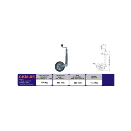 - Roata de sprijin CKM-05 este un accesoriu esential pentru orice remorca, rulota sau platforma, facilitand manevrarea si stabilizarea in timpul stationarii.