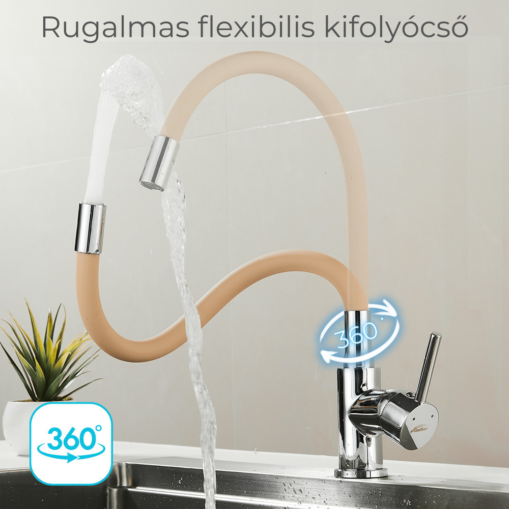 Adu un plus de confort în bucătărie cu robinetul mixer pentru chiuvetă Leziter Corin, în finisaj bej/crom. Pipa flexibilă se modelează ușor și se rotește 360°, ca să speli vase voluminoase sau să direcționezi jetul exact unde ai nevoie. În plus, perlatorul ajută la economisirea apei și reduce stropirea, pentru o utilizare mai curată zi de zi.