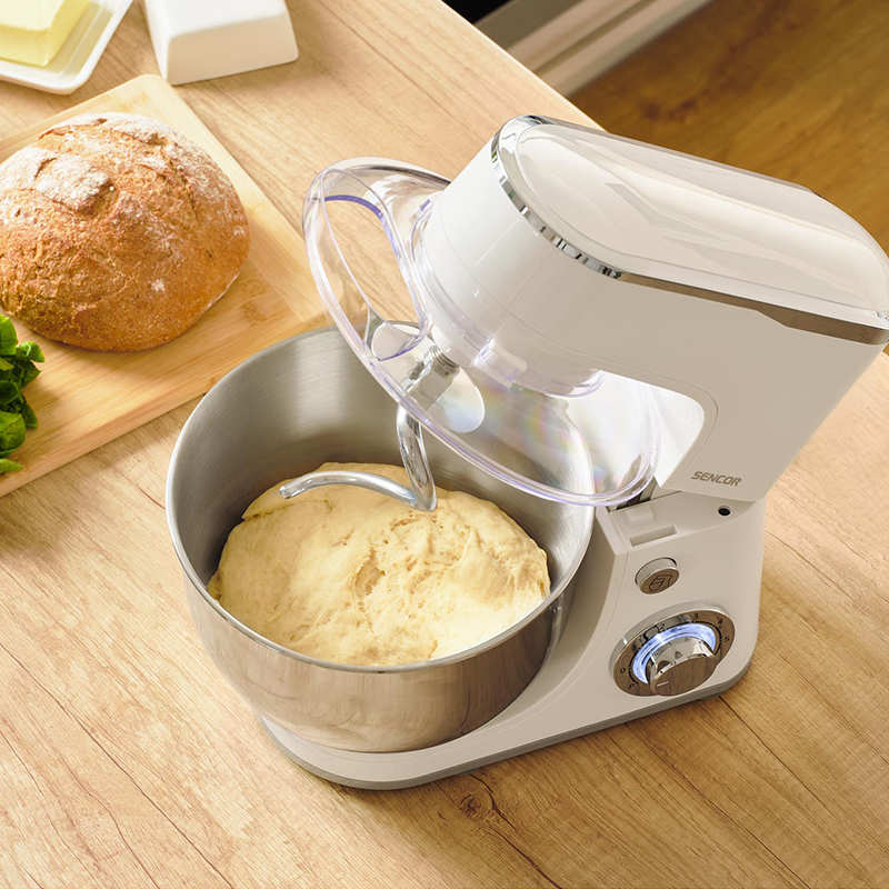 Motor puternic de 1300 W pentru rezultate perfecte Bol mare din oțel inoxidabil de 5,5 l pentru toate tipurile de aluat Setare cu 6 viteze și funcție PULSE 3 accesorii avansate pentru frământare și tel Apărătoare transparentă antistropi cu tub de alimentare Culoare: alb