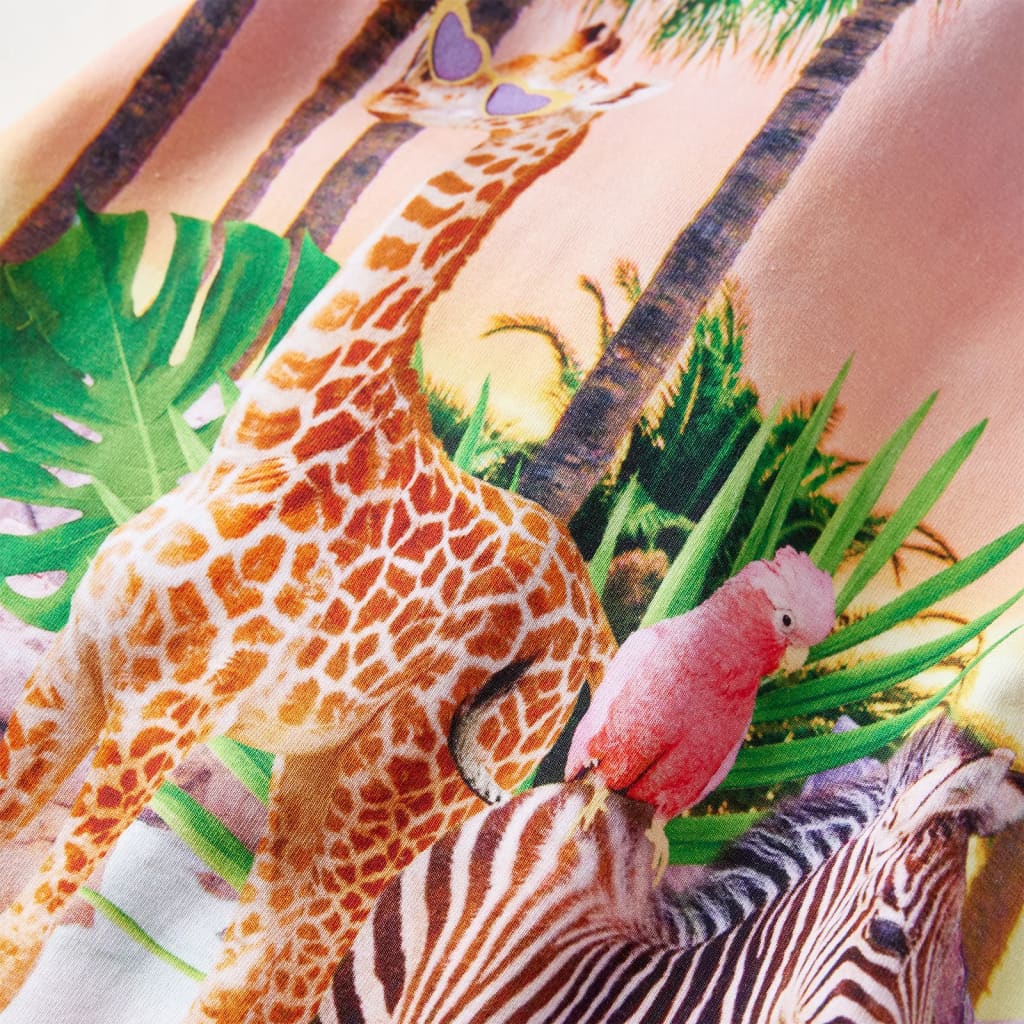 Această rochie fără mâneci pentru copii are un decolteu rotund și se închide cu fermoar invizibil la spate. Această rochie corai pentru copii prezintă un peisaj tropical și imprimeu cu animale pe față. Rochia scurtă pentru copii are legături la spate care trag ușor pe laterale, creând o linie subtilă a taliei fără a fi prea strânsă în jurul ei. Rochia scurtă pentru copii este confecționată din material moale care include bumbac și elastan, pentru confort și respirabilitate.