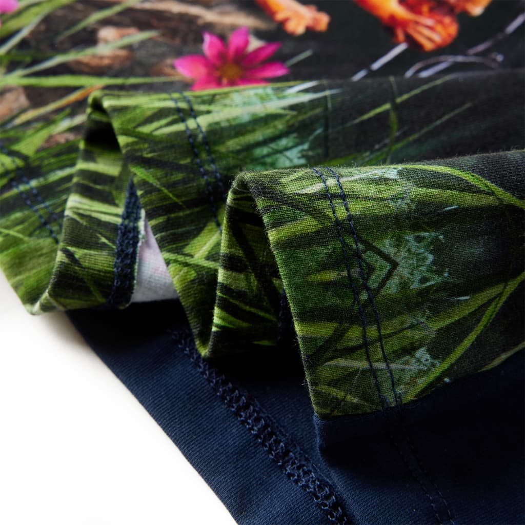 Această rochie pentru copii are mâneci scurte, decolteu rotund și se închide cu nasture la gât. Această rochie pentru copii, de culoare bleumarin, are un imprimeu minunat cu o căprioară. Rochia scurtă pentru copii este confecționată dintr-un material moale care include bumbac și elastan, pentru confort și respirabilitate.