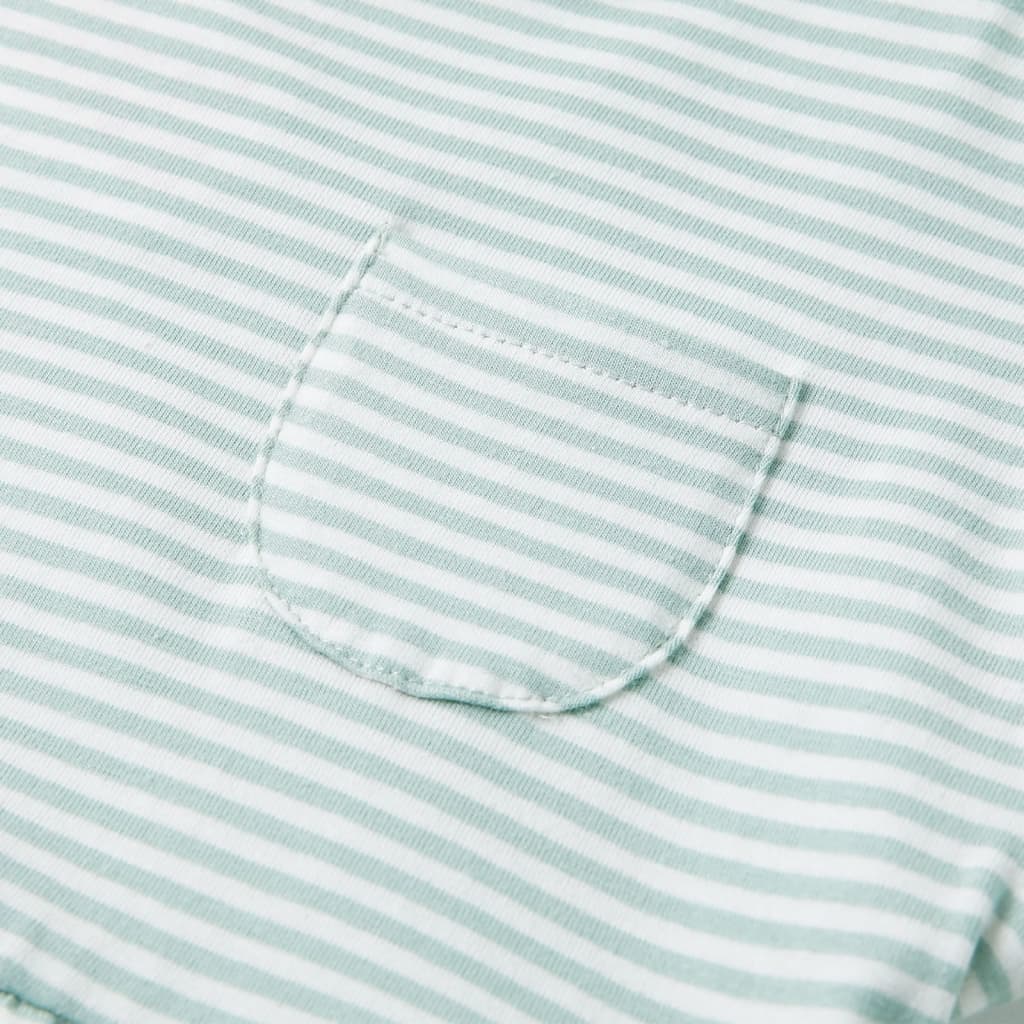 Această rochie pentru copii are un decolteu rotund, mâneci cu volane și un buzunar pe piept. Această rochie pentru copii, de culoare verde mentă, are dungi peste tot. Rochia scurtă pentru copii este confecționată dintr-un material moale care include bumbac și elastan, pentru confort și respirabilitate.