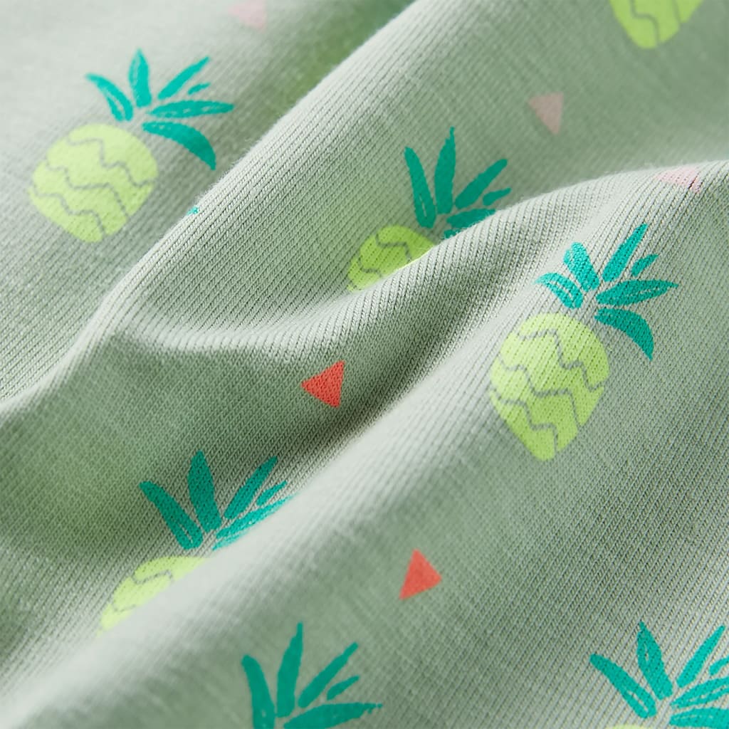 Această rochie pentru copii are un decolteu rotund, imprimeu peste tot și o betelie cu șnur în talie. Această rochie pentru copii este imprimată cu ananași peste tot. Rochia scurtă pentru copii este confecționată dintr-un material moale care include 92% bumbac și 8% elastan, pentru confort și respirabilitate.