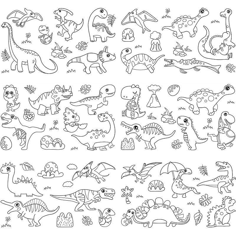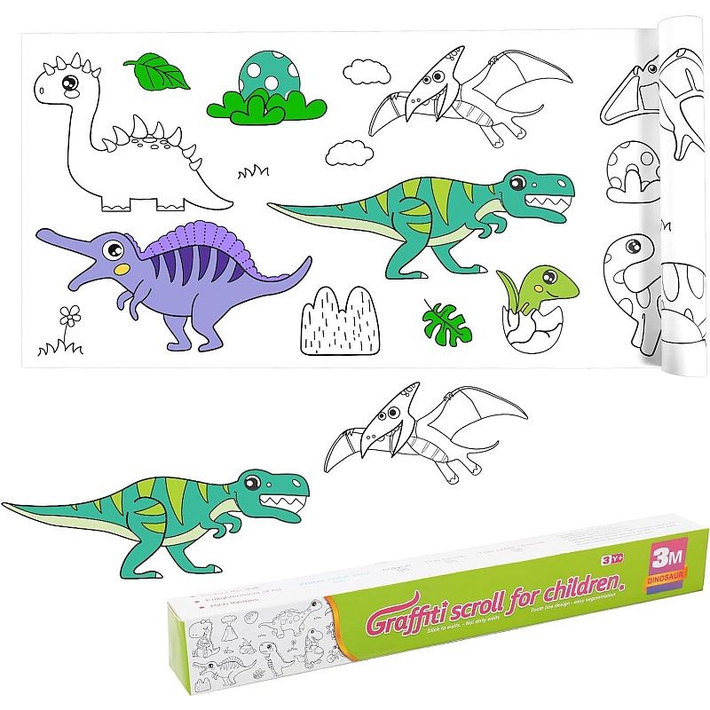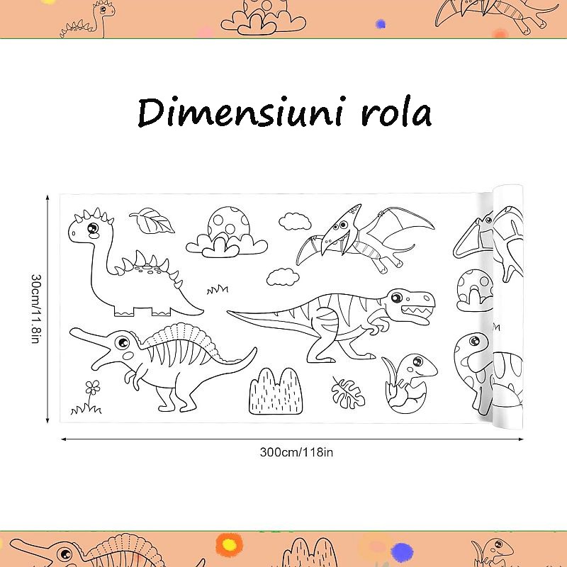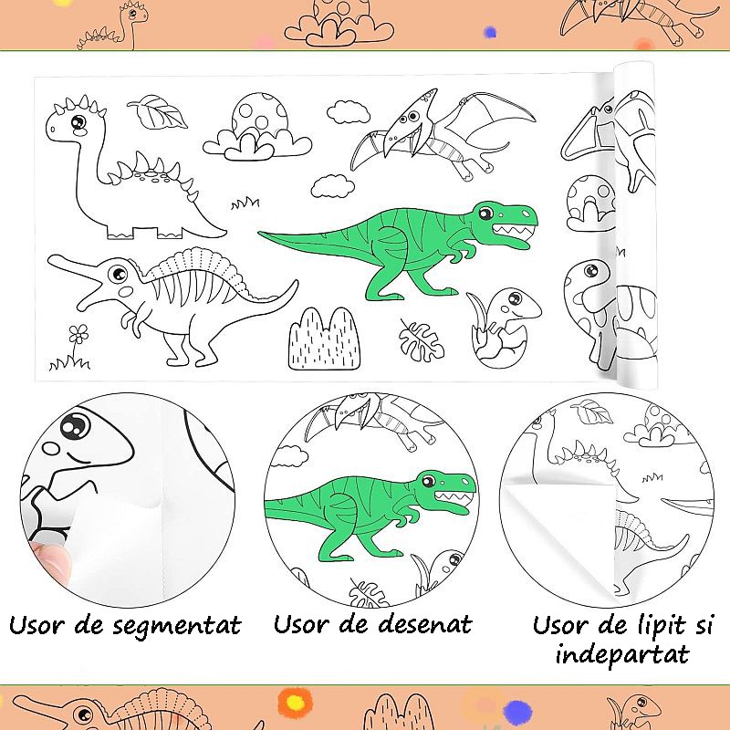 Rola de colorat autocolantă cu dinozauri, 30x300 cm, pentru perete și birou