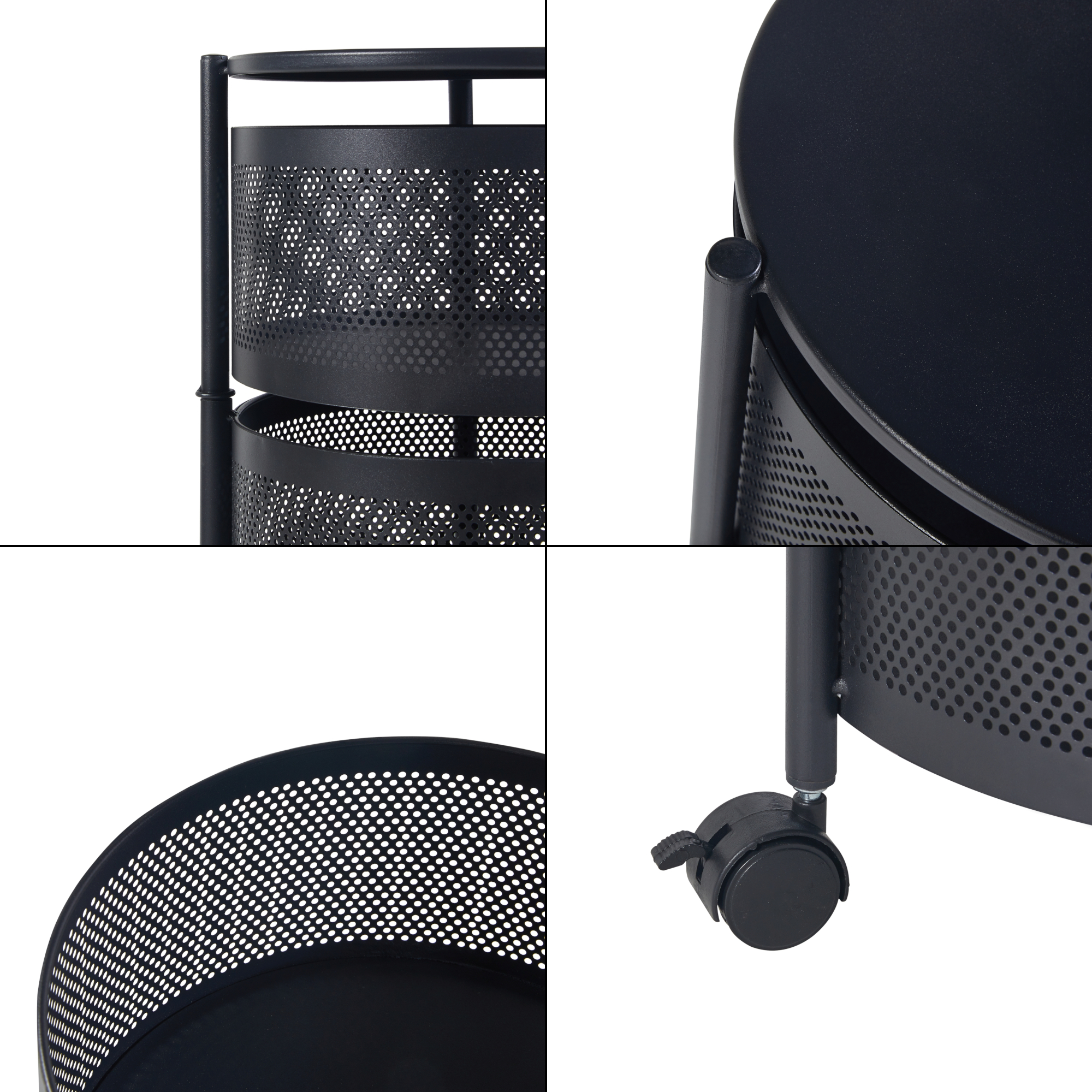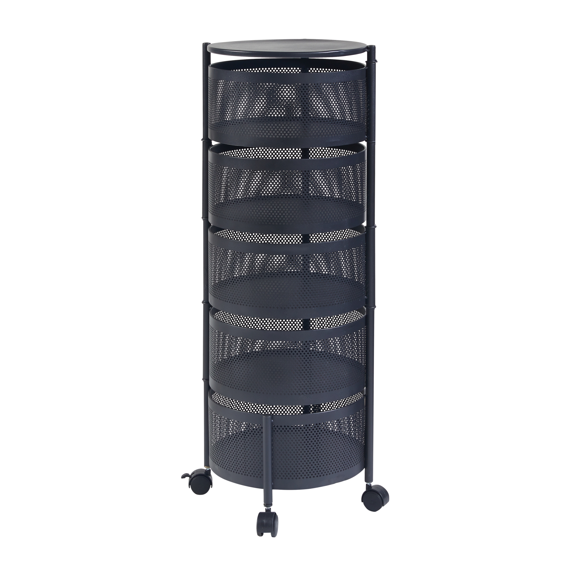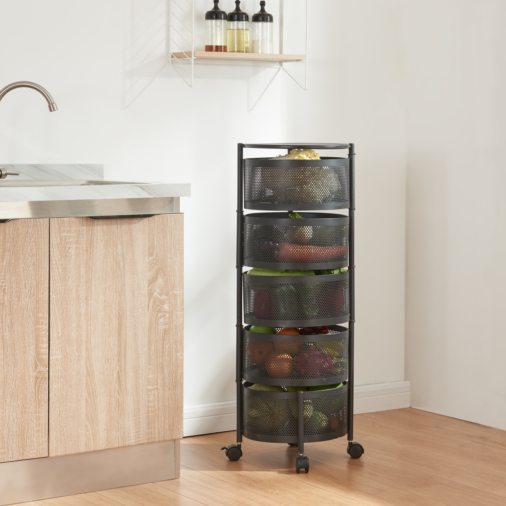Die fünf runden Ablagekörbe bieten ausreichend Platz für Geschirr, Getränke, Snacks oder andere Gegenstände, die Sie griffbereit haben möchten. Dank der ausklappbaren oberen vier Ablagekörbe können Sie sämtliche Objekte nicht nur mühelos erreichen, sondern auch schnell und praktisch verstauen.