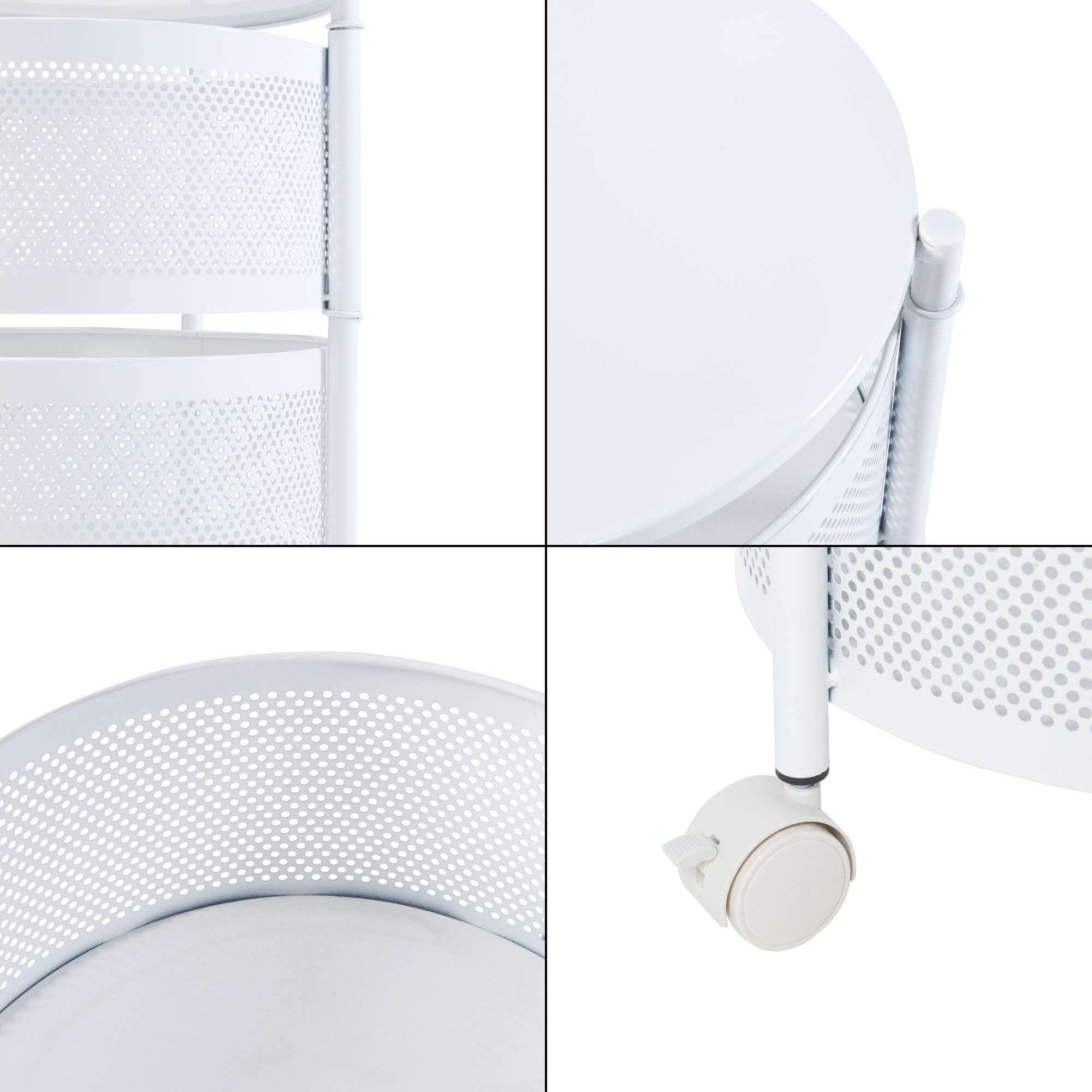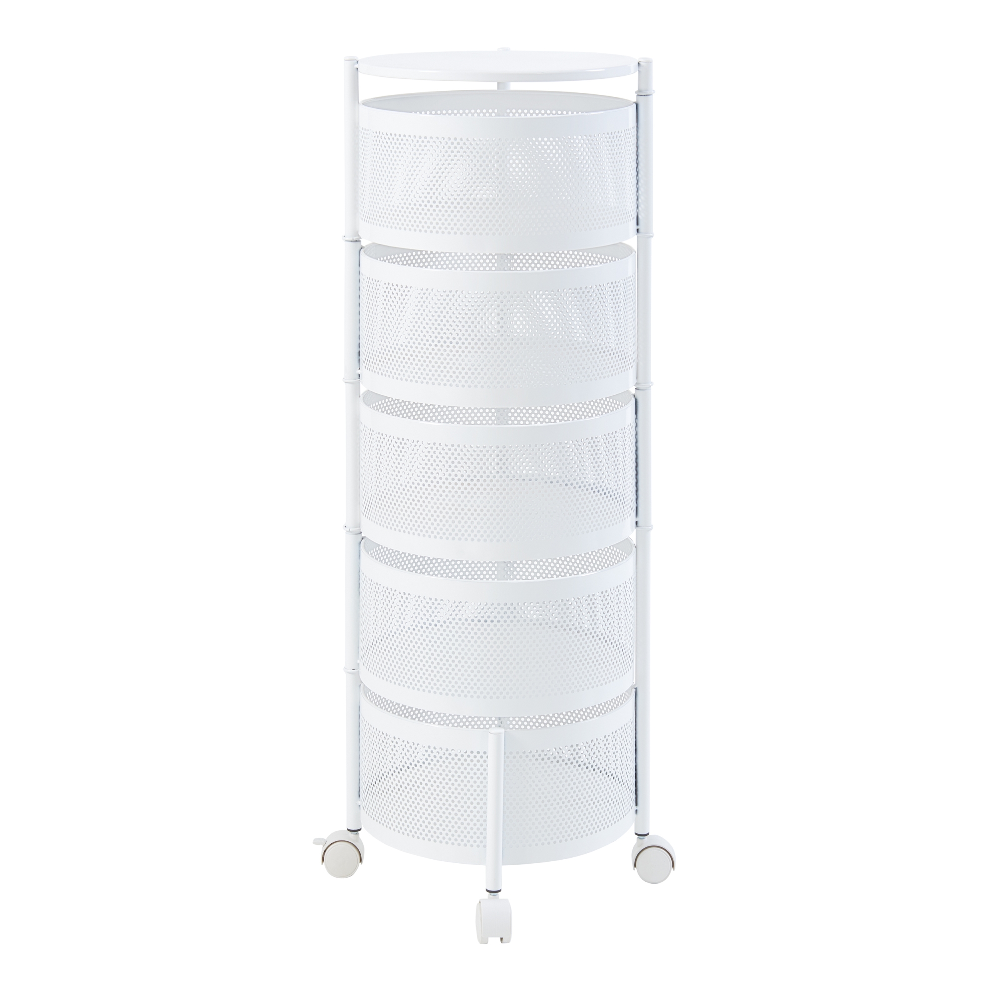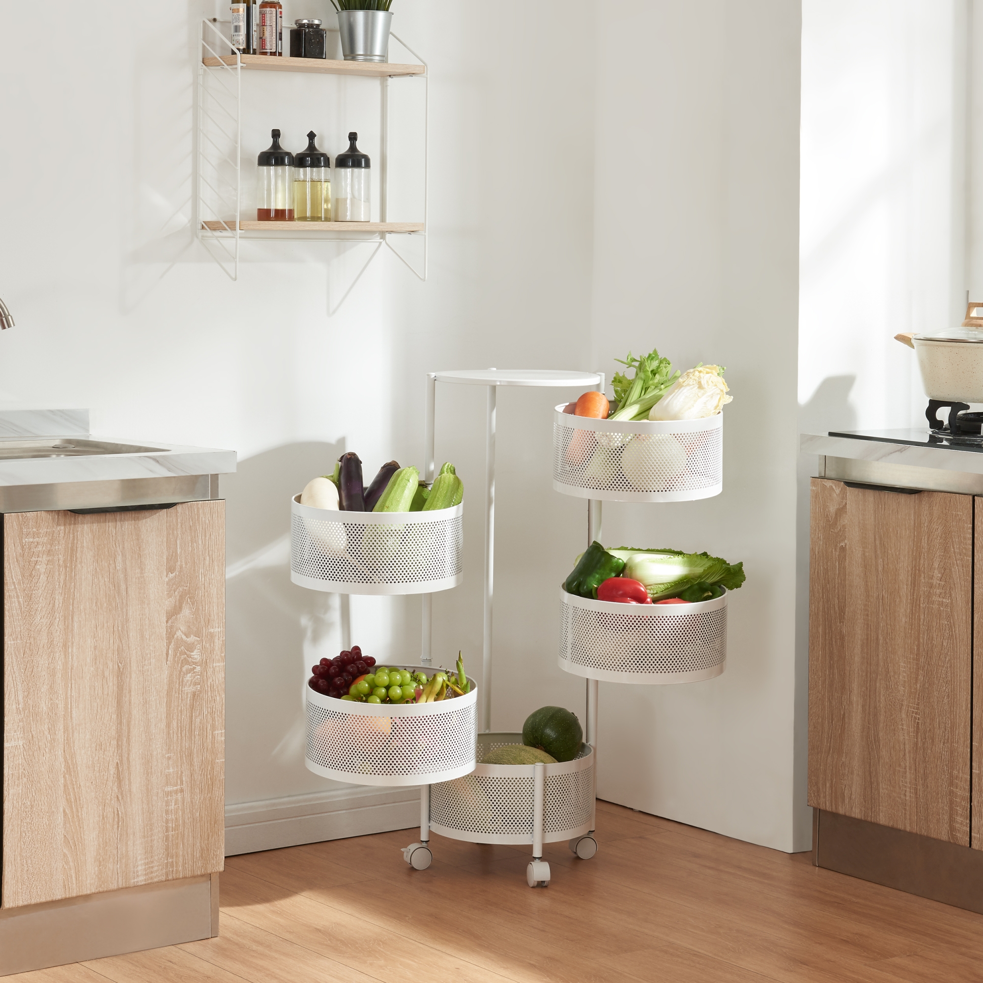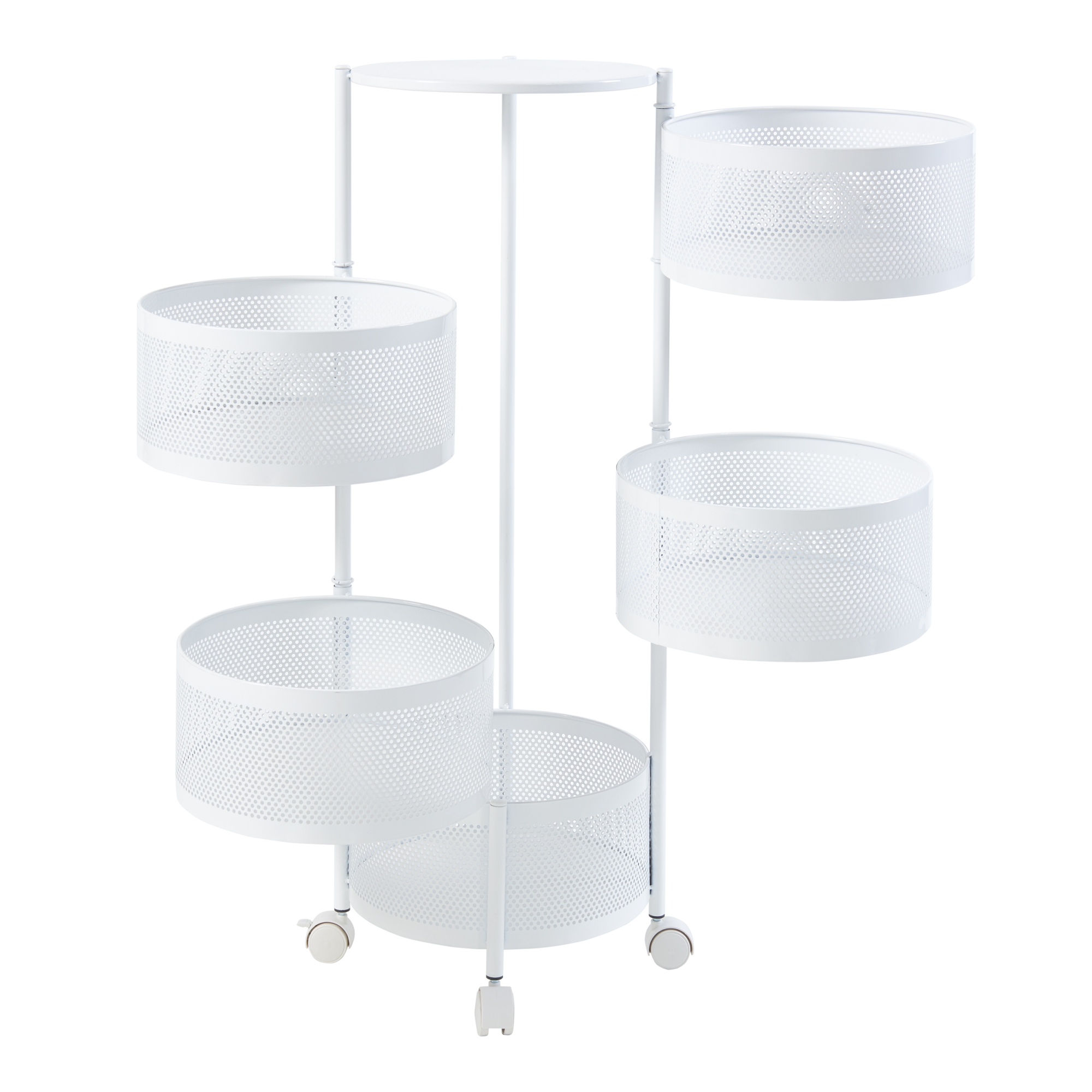 Die fünf runden Ablagekörbe bieten ausreichend Platz für Geschirr, Getränke, Snacks oder andere Gegenstände, die Sie griffbereit haben möchten. Dank der ausklappbaren oberen vier Ablagekörbe können Sie sämtliche Objekte nicht nur mühelos erreichen, sondern auch schnell und praktisch verstauen.