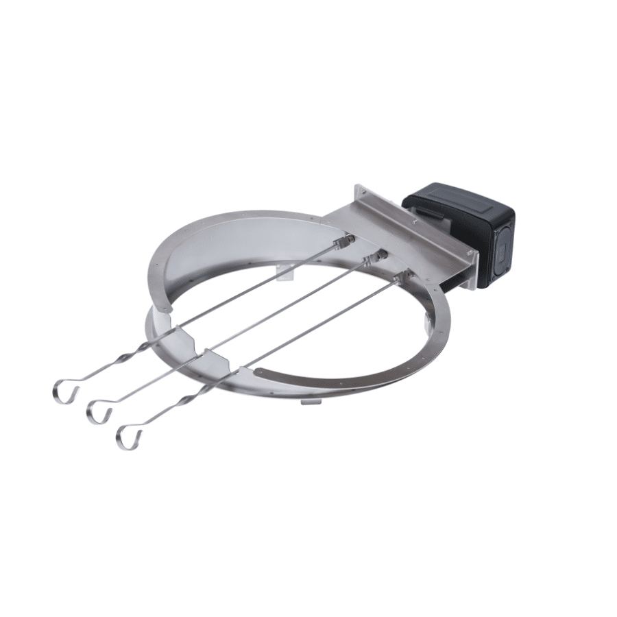 Rotisorul din oțel inoxidabil este acum disponibil și pentru Monolith ICON și Junior. Forma de pană testată permite, de asemenea, utilizarea cu capacul închis. Rotisorul este prevăzut cu un set de 3 frigărui robuste din oțel inoxidabil care sunt rotite simultan de motorul alimentat cu baterii (motor alternativ de 220 V). Un set disponibil opțional cu cleme pentru frigărui atașabile permite fixarea pe frigărui a alimentelor mai mari. Caracteristici:- Se potrivește pentru grătarele ceramice Monolith JUNIOR și ICON