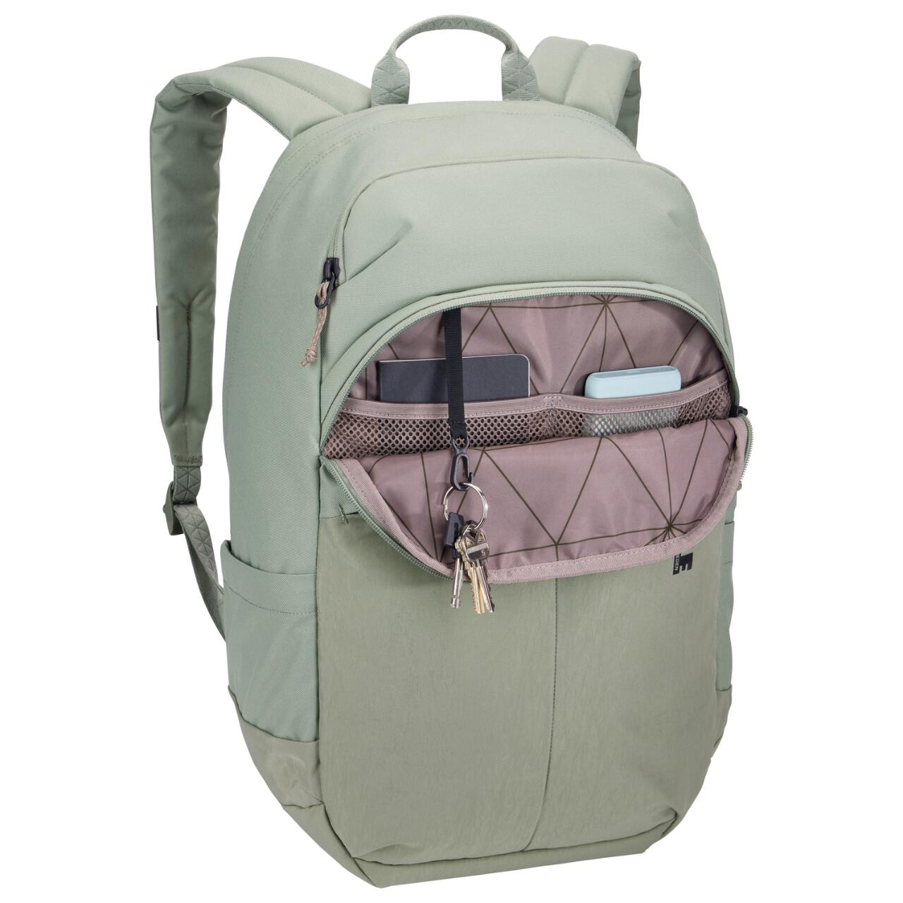 Compartimentul dedicat protejeaza un laptop de pana la 16 inch, inclusiv MacBook Pro de 16 inch, datorita buzunarului inaltat si captusit. In plus, compartimentul principal incapator permite transportul comod al cartilor, dosarelor si obiectelor necesare pe parcursul zilei. Pentru acces rapid, ai la dispozitie buzunar superior captusit pentru telefon sau ochelari, buzunar interior transparent pentru accesorii mici si un compartiment secundar cu carabina pentru chei.