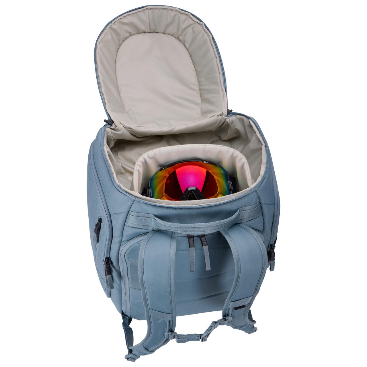Compartimentul superior permite acces rapid la casca si ochelari, iar buzunarele laterale incapatoare sunt ideale pentru manusi, haine sau alte accesorii. In plus, compartimentul frontal ofera loc pentru imbracaminte uscata, echipament suplimentar sau articole necesare dupa ski.