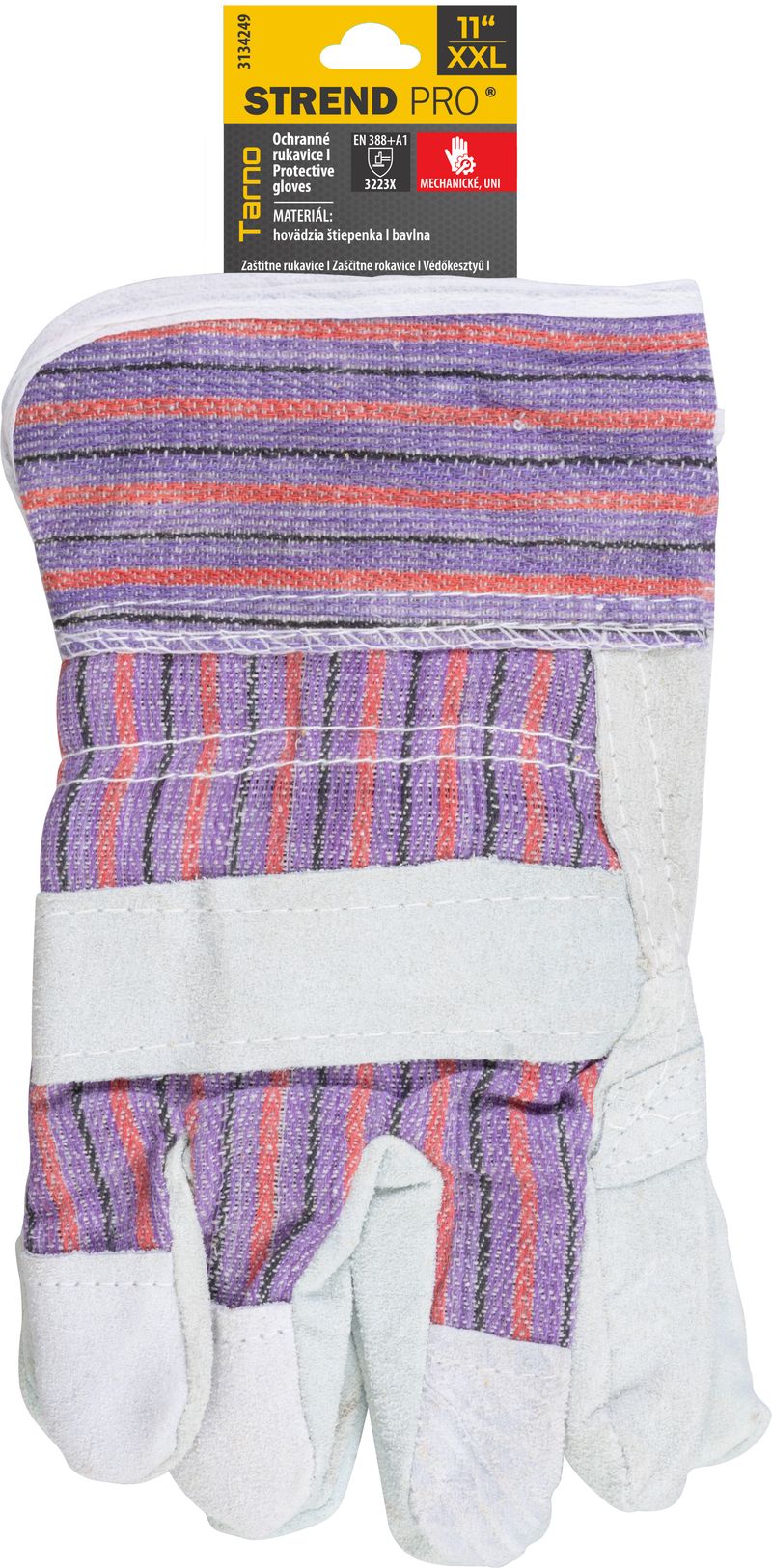 Kombinované ochranné rukavice Strend Pro Tarno sú vyrobené z hovädzej štiepenky a bavlny s podšívkou dlane. Majú voľnú vystuženú manžetu. Spĺňajú normu EN ISO 21420:2020 (cat II). Sú určené na ochranu kože pred mechanickými rizikami podľa normy EN 388:+A1, s úrovňou ochrany 3223X. Uvedené stupne ochrany sa vzťahujú iba na dlaňovú časť nových nepoškodených a neopotrebovaných rukavíc. Veľkosť: 11/XXL.