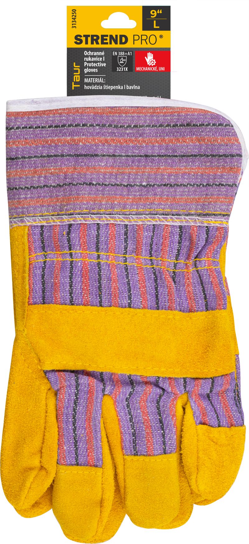 Kombinované ochranné rukavice Strend Pro Taur sú vyrobené z hovädzej štiepenky a bavlny s podšívkou dlane. Majú voľnú vystuženú manžetu. Spĺňajú normu EN ISO 21420:2020 (cat II). Sú určené na ochranu kože pred mechanickými rizikami podľa normy EN 388:+A1, s úrovňou ochrany 3231X. Uvedené stupne ochrany sa vzťahujú iba na dlaňovú časť nových nepoškodených a neopotrebovaných rukavíc. Veľkosť: 09/L.