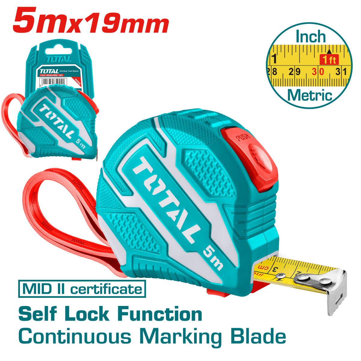 Ruletă TOTAL 5 m x 19 mm cu auto-blocare și retragere controlată, MID II