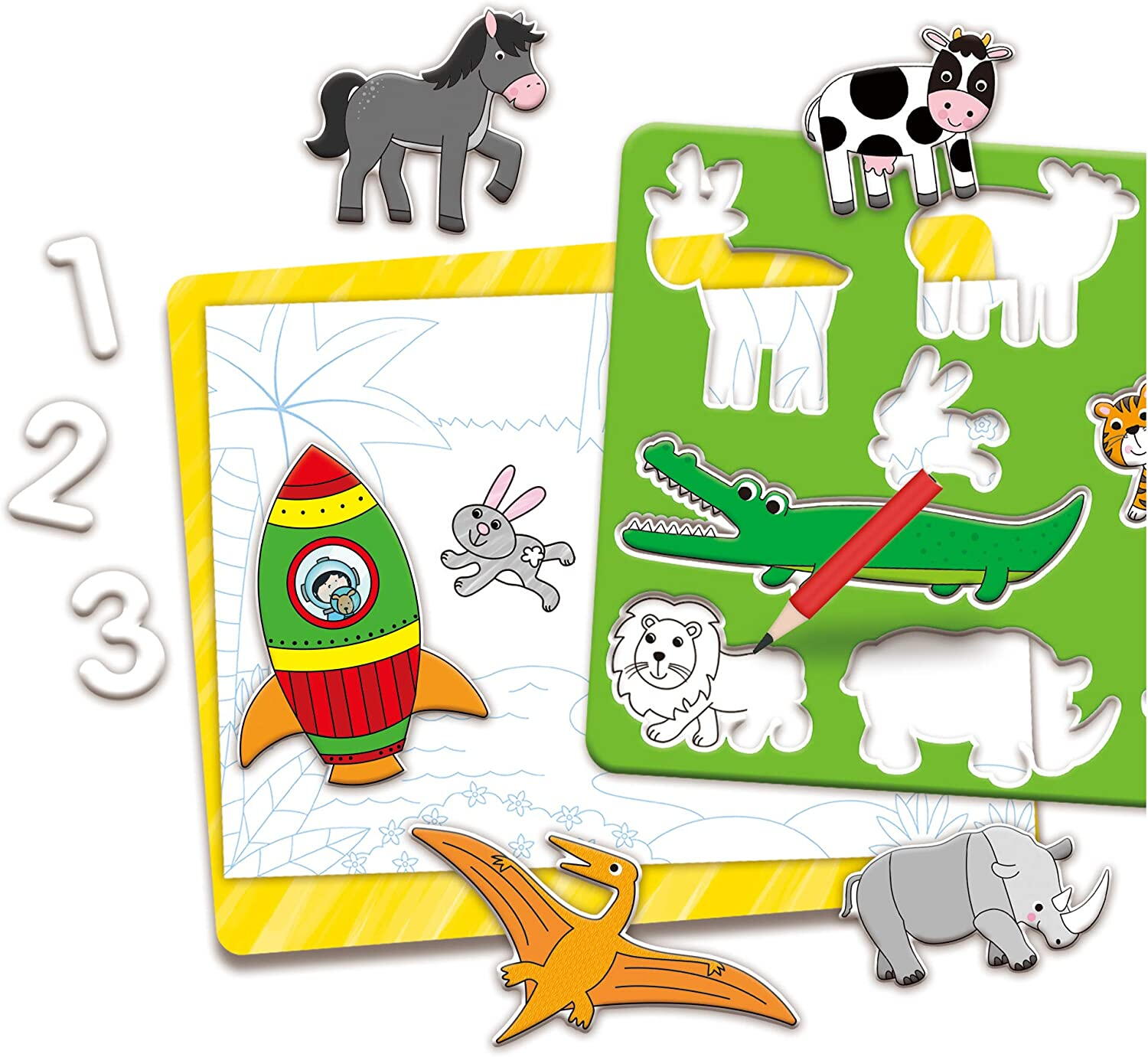 Utilizare: asezati una dintre foile imprimate pe suportul special, pozitionati sablonul magnetic dorit, apoi copilul poate trasa si colora pentru a obtine desene clare si atractive.