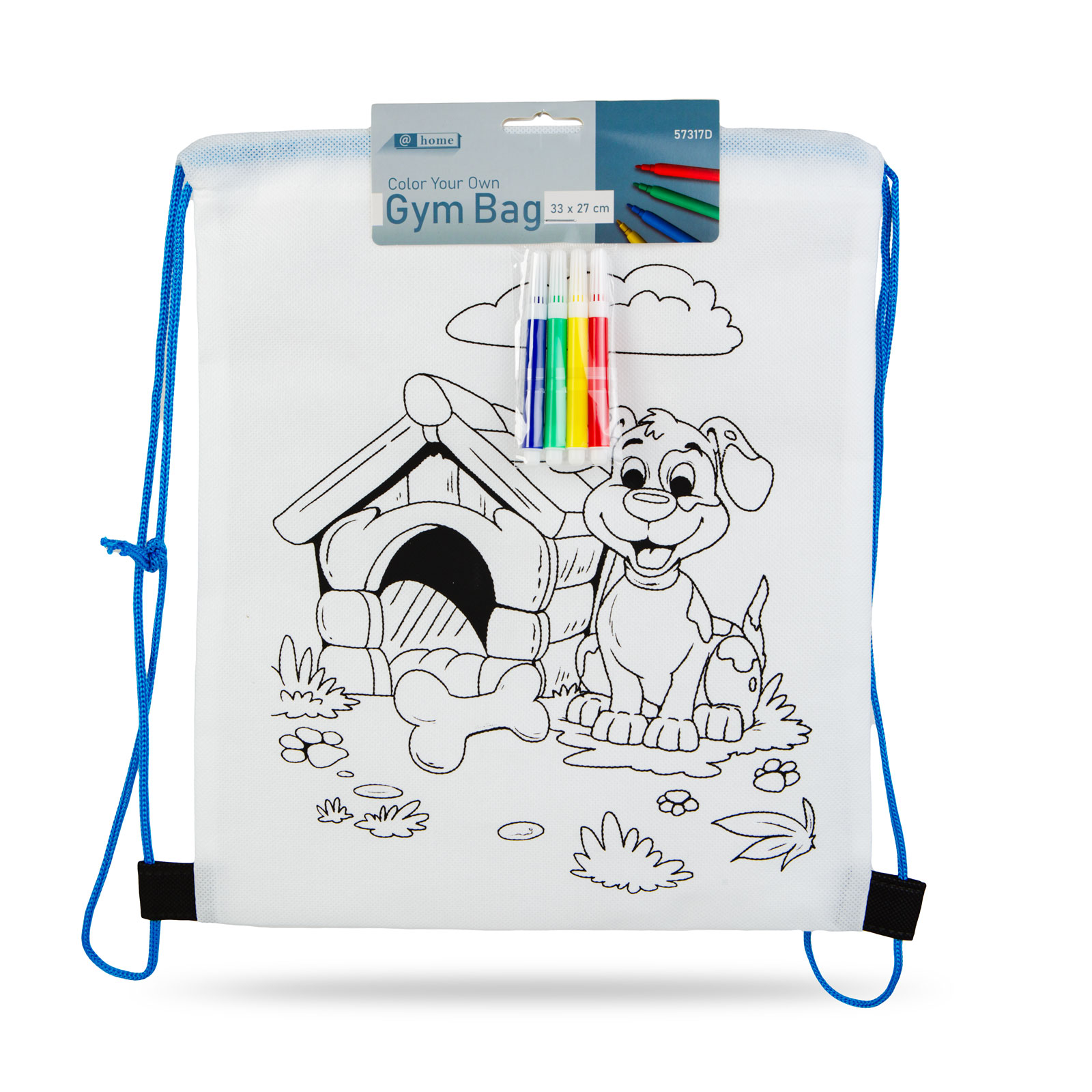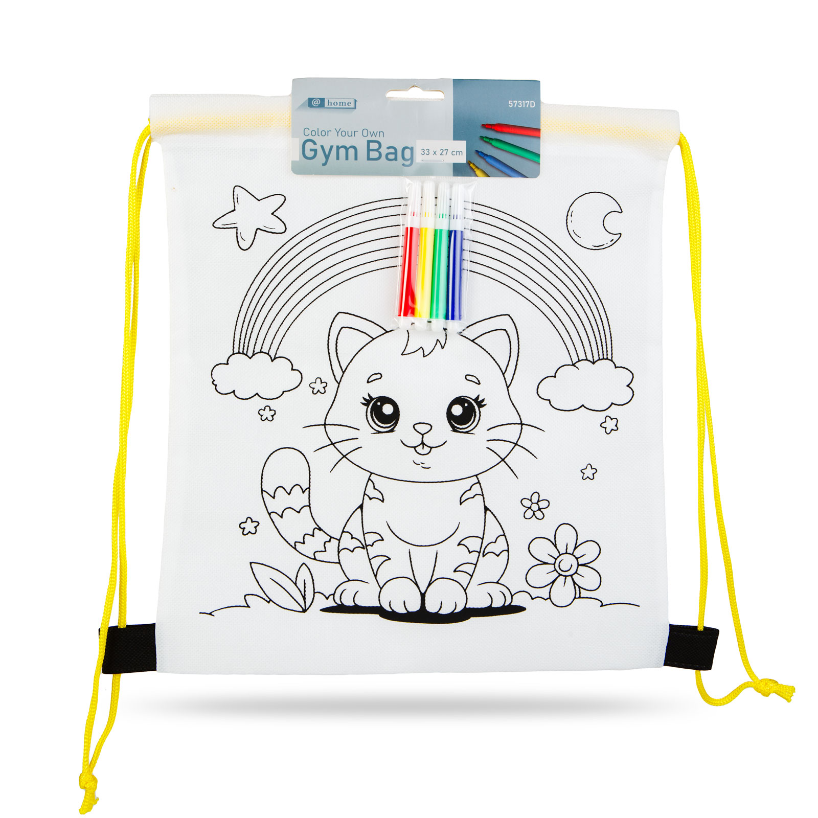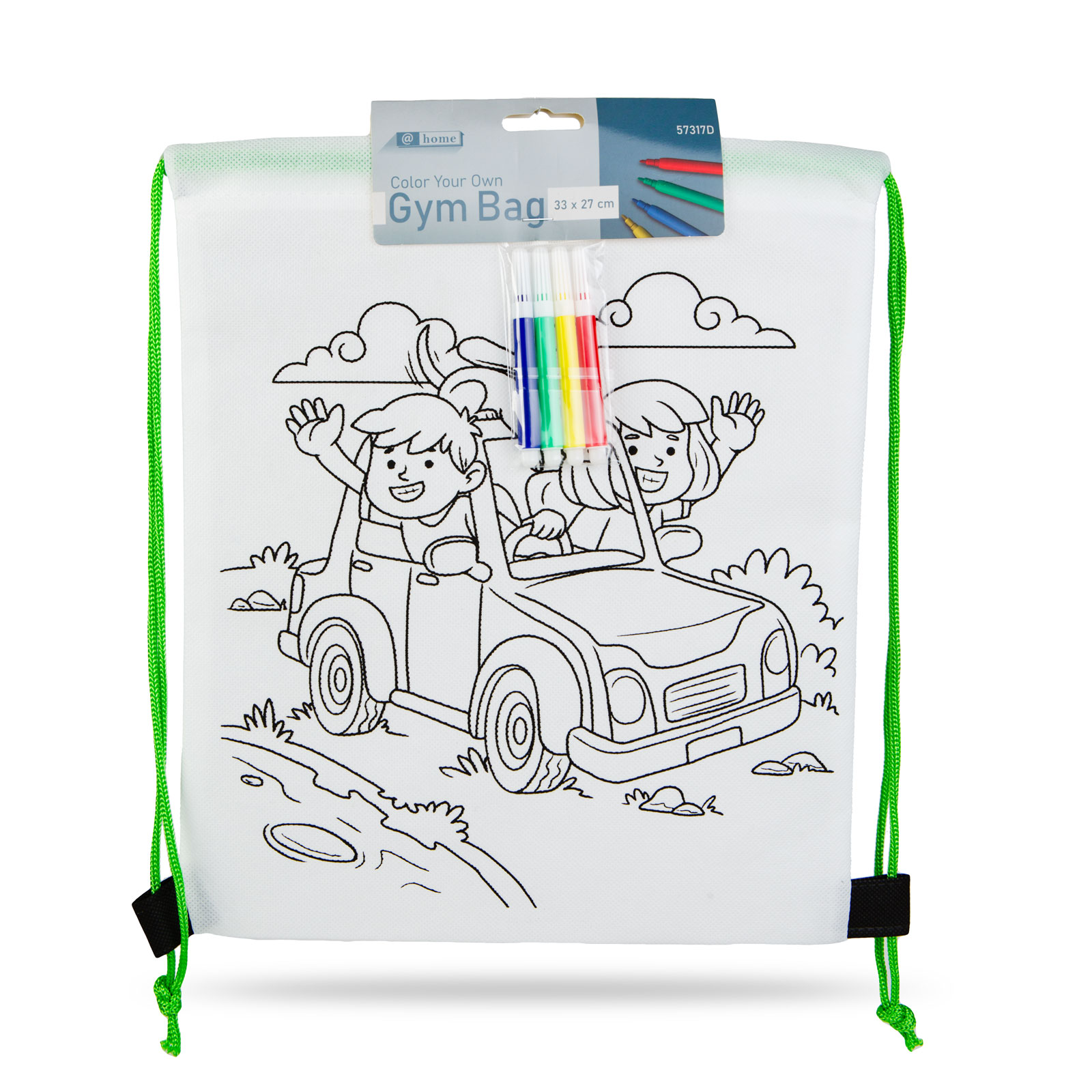Acest sac de sport colorabil, cu dimensiunile de 33 x 27 cm, este ideal pentru copii și include 4 markere colorate. Fabricat din material PET (nețesut), oferă 4 modele diferite, combinând funcționalitatea unui sac de gimnastică sau rucsac cu o activitate creativă. Pentru colorare, se recomandă introducerea unui carton gros între cele două straturi ale sacului pentru a preveni scurgerea culorilor. Perfect pentru școală, decor sau cadouri.