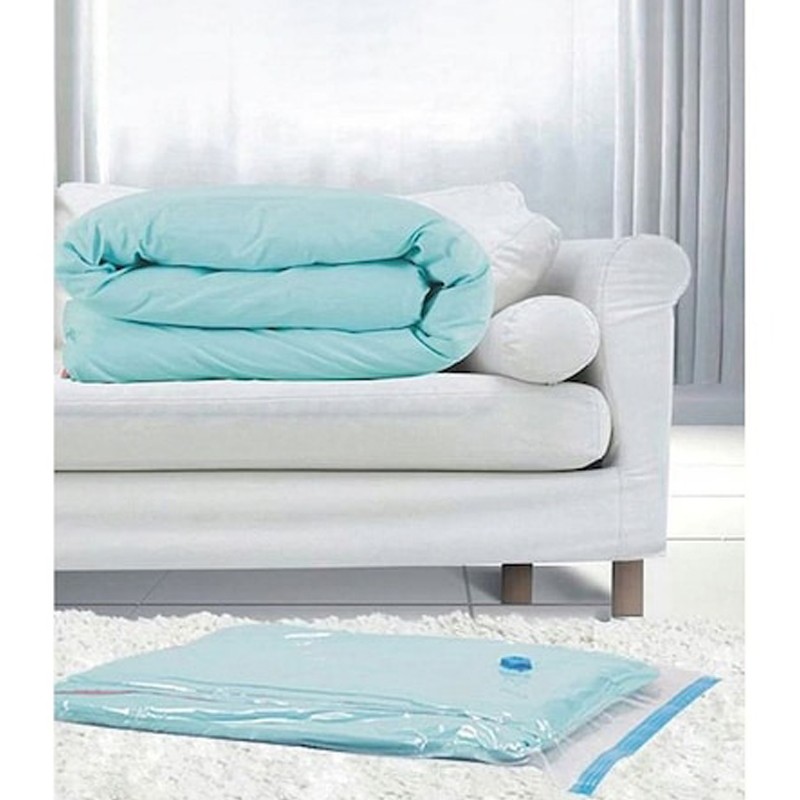 Cu ajutorul sacului pentru vidat va puteti depozita cu usurinta hainele pe durata renovarilor, paturile, lenjeriile de pat sau alte articole textile. Hainele depozitate vor fi protejate de praf, umezeala si mucegai si vor ocupa doar o treime din spatiul ocupat anterior.