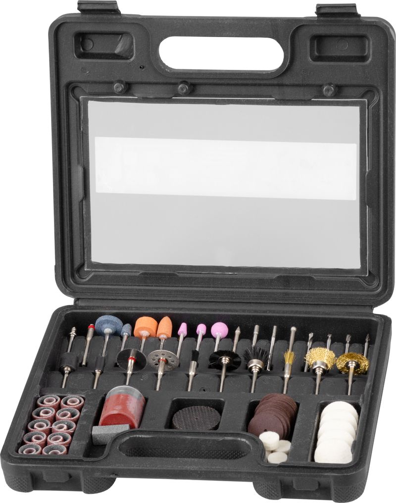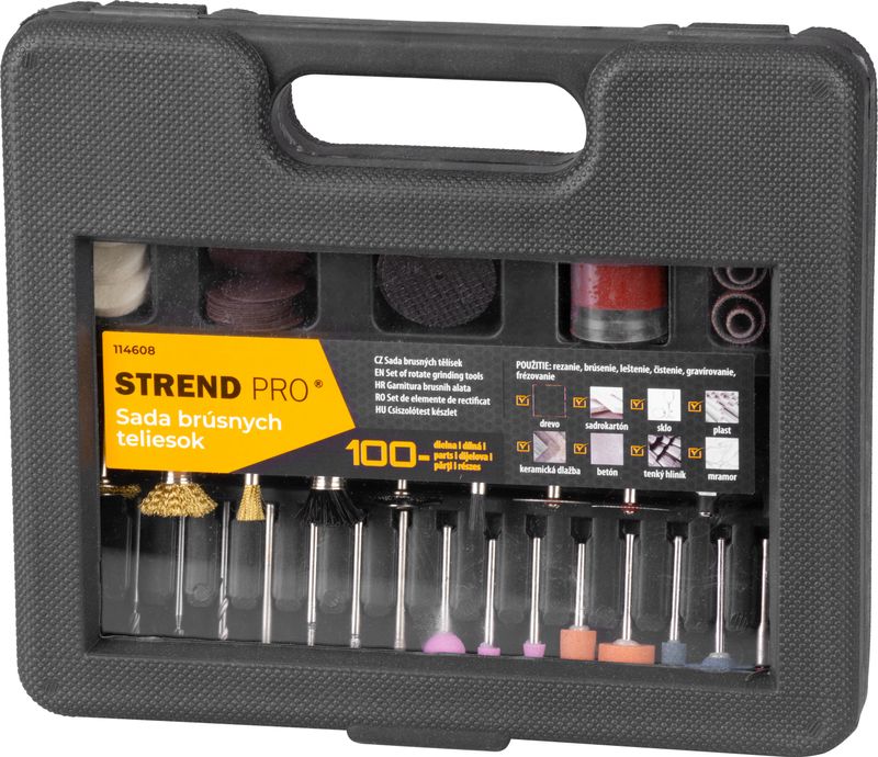 Sada brúsnych teliesok Strend Pro je vhodná pre mini brúsku na rezanie, vŕtanie, brúsenie, leštenie, čistenie, gravírovanie a frézovanie. Sada obsahuje: 1x brúsny kameň.Na frézovanie:6x HSS frézka.Čistenie:3x nylonová kefa, 3x mosadzná kefa.Na brúsenie:11x brúsne teliesko, 22x brúsny valček.Na rezanie:31x korundový rezný kotúč, 1x stopka, 5x rezný kotúč.Na leštenie:1x leštiaca pasta, 1x stopka, 15x plstený kotúč. Spolu obsahuje až 100 brúsnych teliesok.
