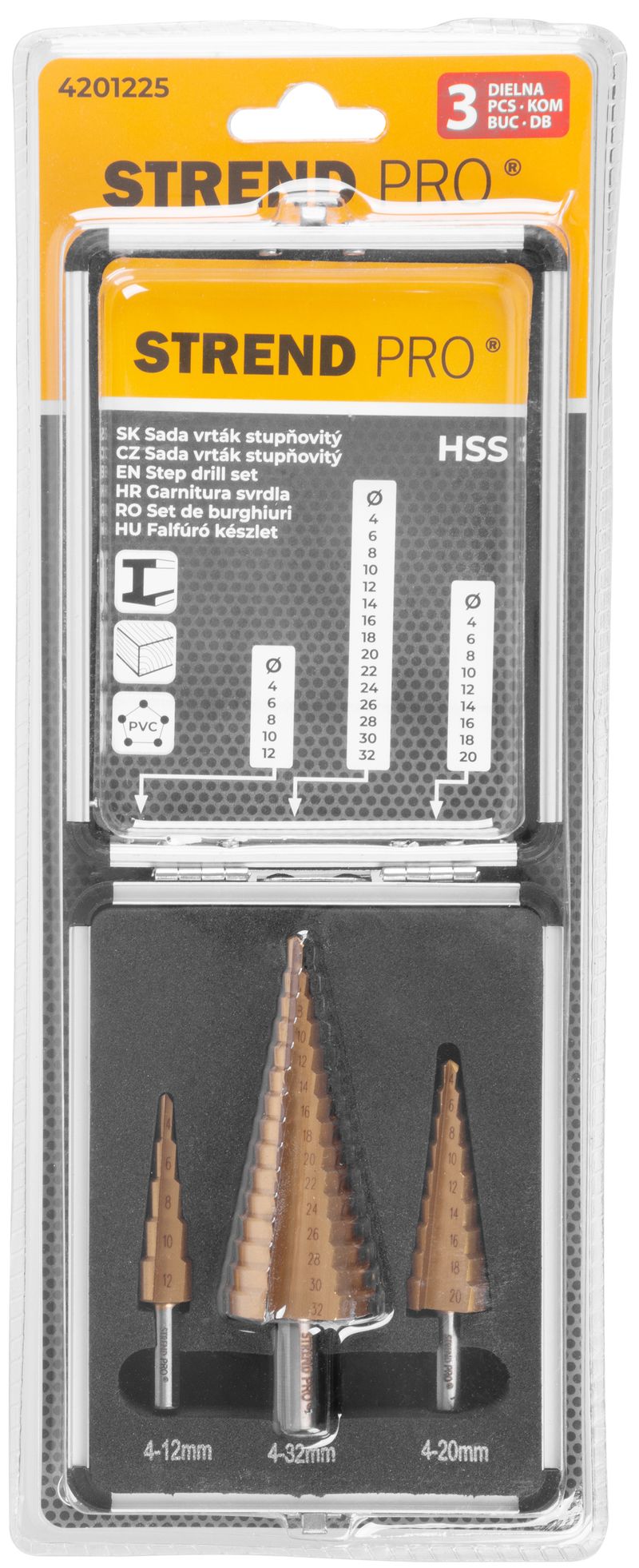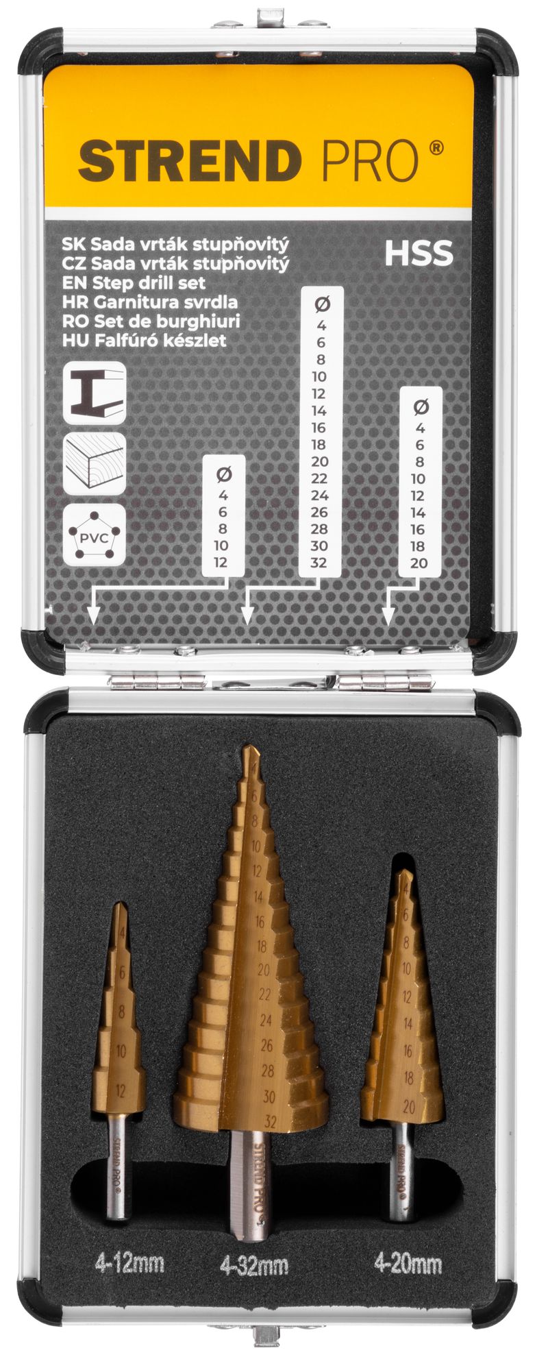 Sada troch stupňovitých vrtákov Strend Pro HSS s titánovou úpravou. Použitie: kov, drevo, plast. V praktickom hliníkovom kufríku nájdete vrtáky s rozmermi: 4-12 mm, 4-20 mm a 4-32 mm.