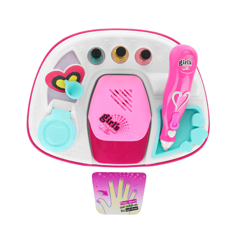 Consola portabila ofera un spatiu de joaca atractiv, unde cei mici isi pot usca unghiile cu ajutorul mini-lampii incluse, apoi pot aplica modele folosind glitter, pensule sau sabloane autoadezive. Fiecare element este gandit astfel incat copilul sa se joace in siguranta si sa-si dezvolte creativitatea si indemanarea.