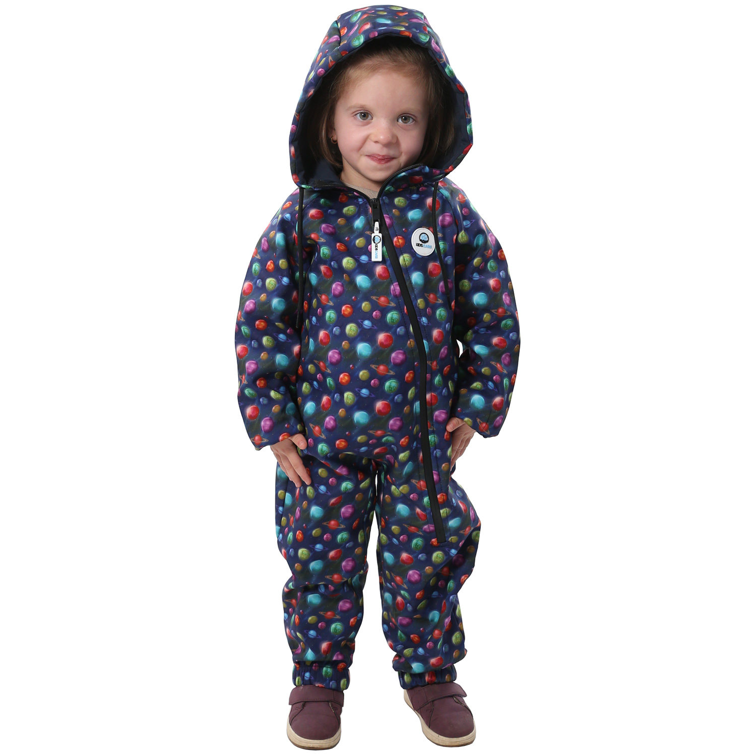 Salopeta impermeabila pentru copii Kidscare, cu protectie la vant si apa cu imprimeu Planete - marime 110