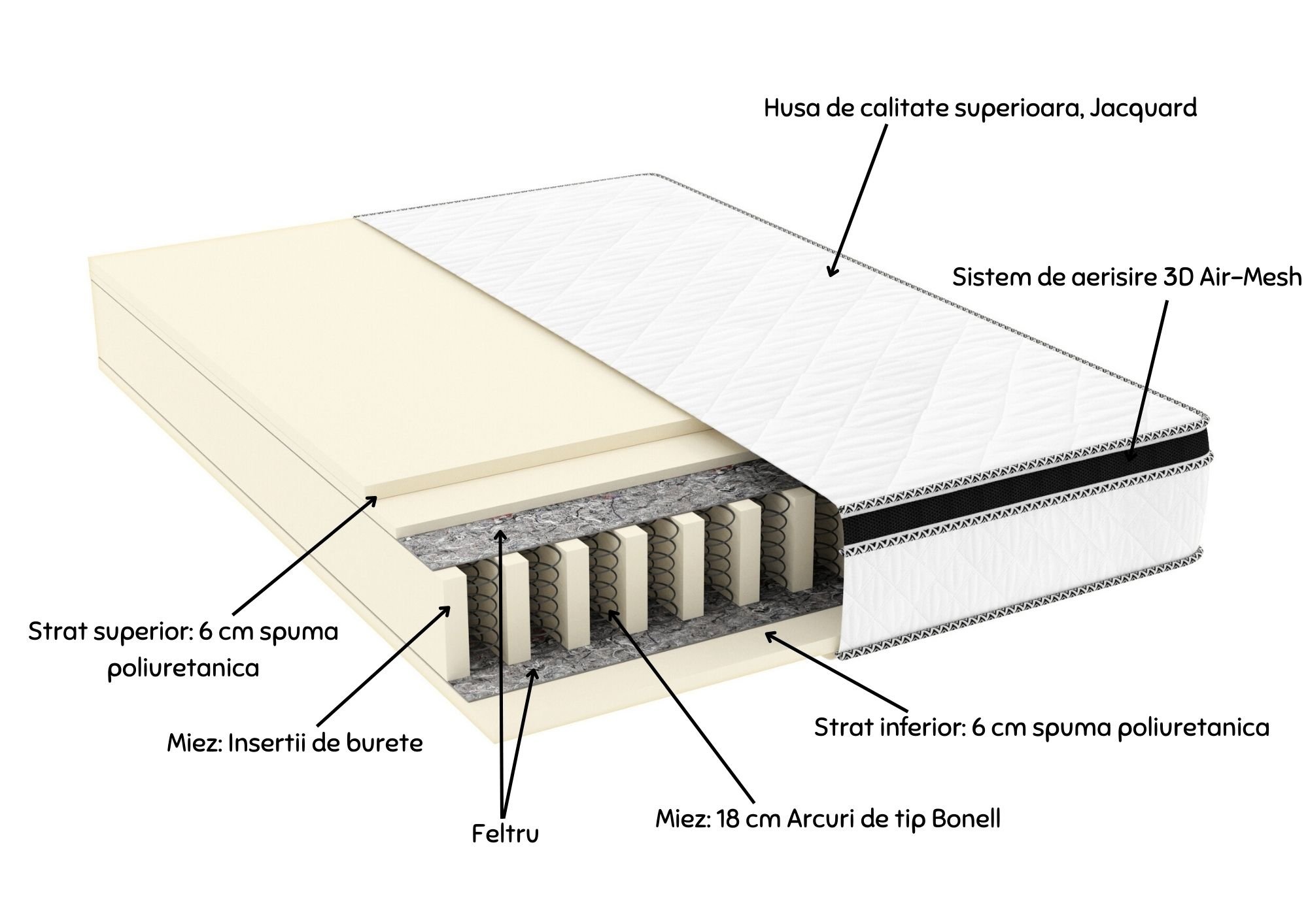 - Miezul: Arc tip Bonnell din oțel carbon, 2,2 mm, și inserții de burete printre arcuri.