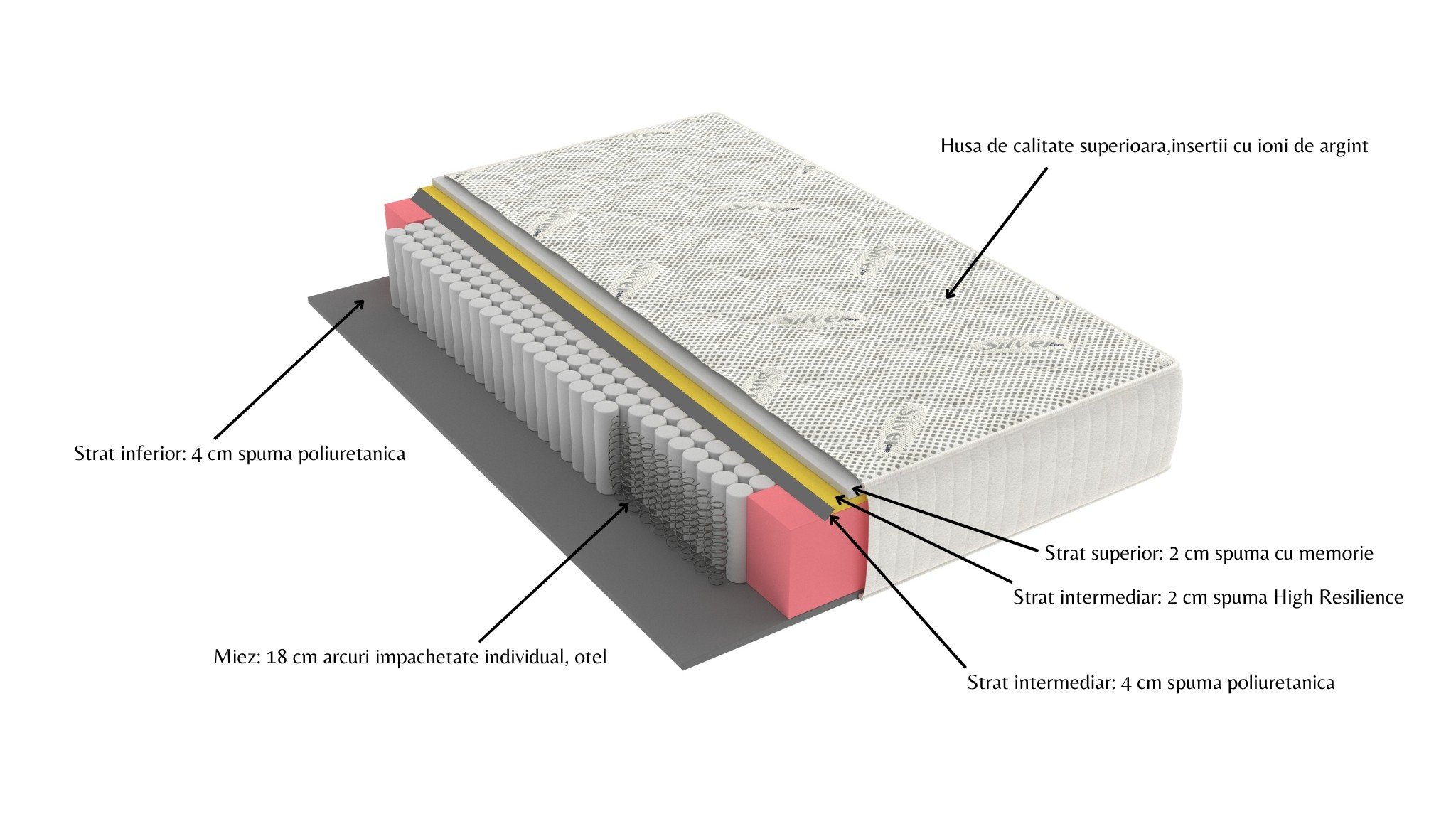 - Compozitie miez: 2 cm spuma cu memorie, 2 cm spuma High Resilience, 4 cm spuma poliuretanica, 18 cm arcuri Pocket Spring, 4 cm spuma poliuretanica