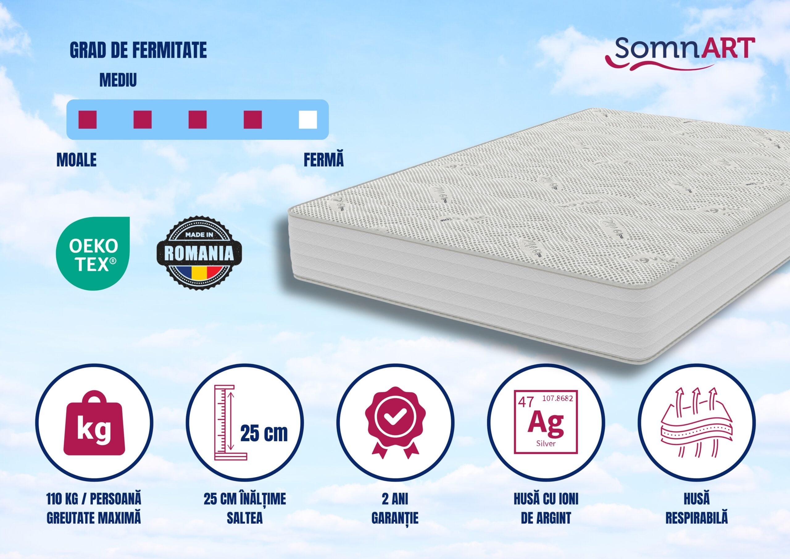 - Straturi confort: spuma poliuretanica 3 cm sus + 3 cm jos