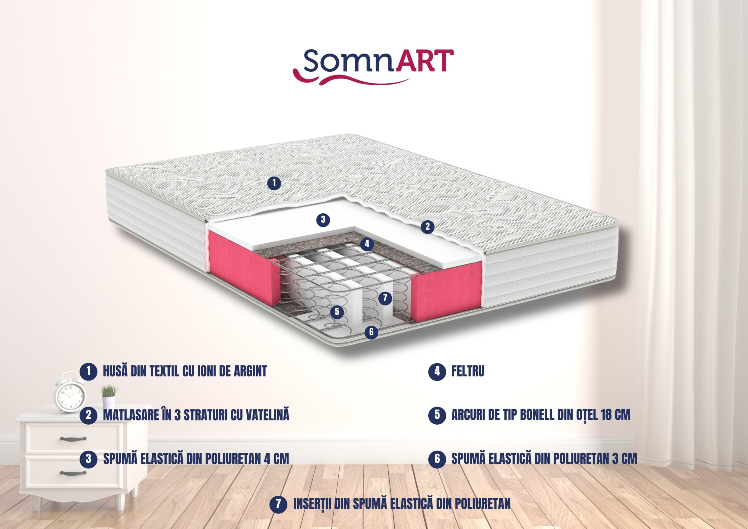 - Straturi confort: spuma poliuretanica 3 cm sus + 3 cm jos