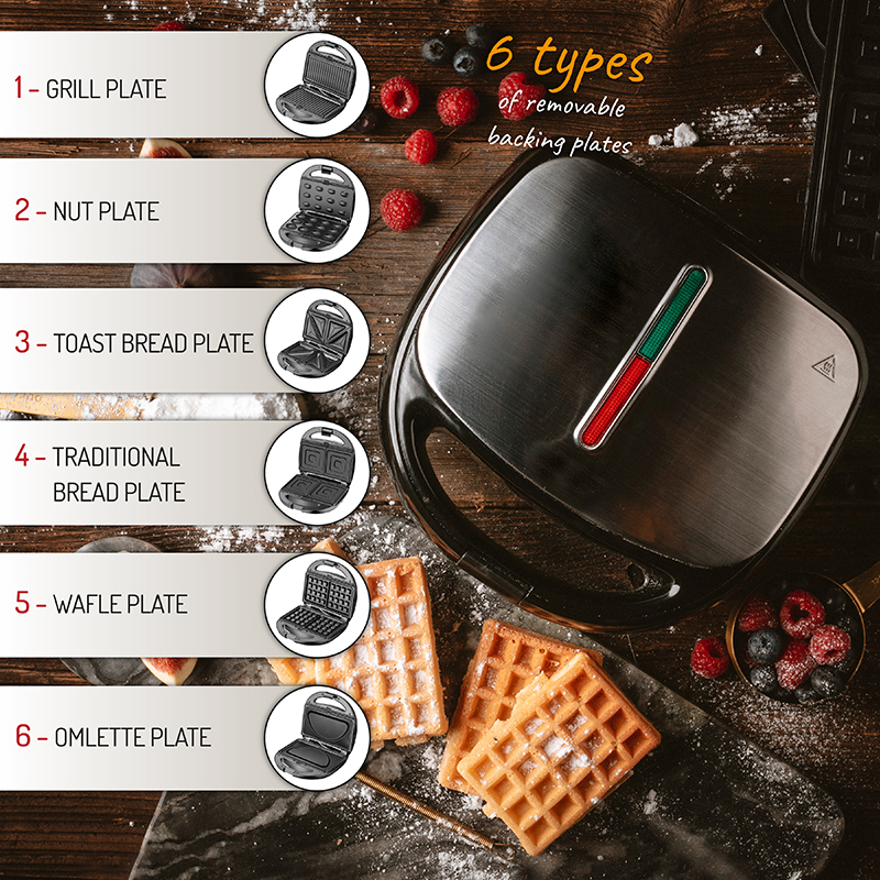 Transforma micul dejun si gustarile intr-o placere cu sandwich maker 6 in 1 Camry CR 3057. Cu putere maxima de 1200W si placi interschimbabile, pregatesti rapid sandwich-uri, vafe, gustari la gratar sau deserturi, fara batai de cap.