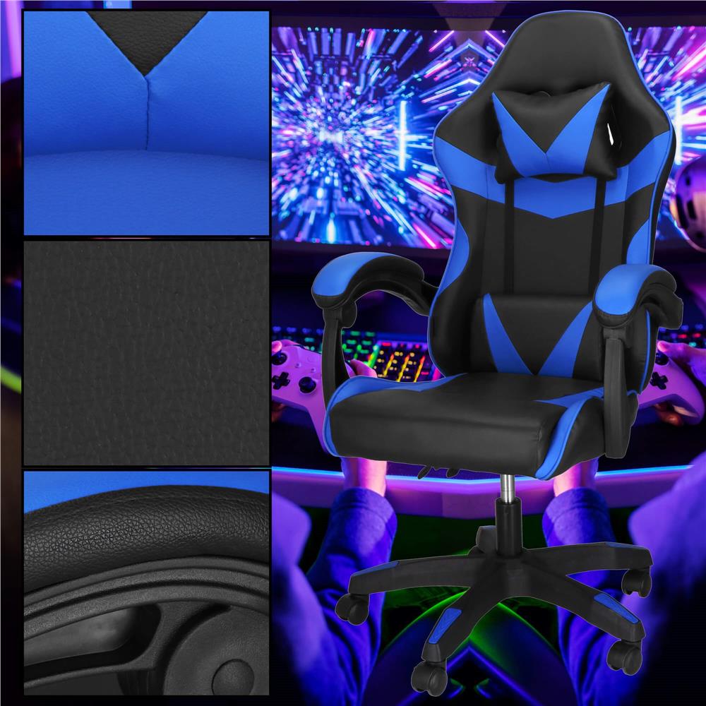 Scaun birou pentru gaming, ergonomic, suport lombar si tetiera, 114-123x55x50 cm, negru si albastru Household NewTrend