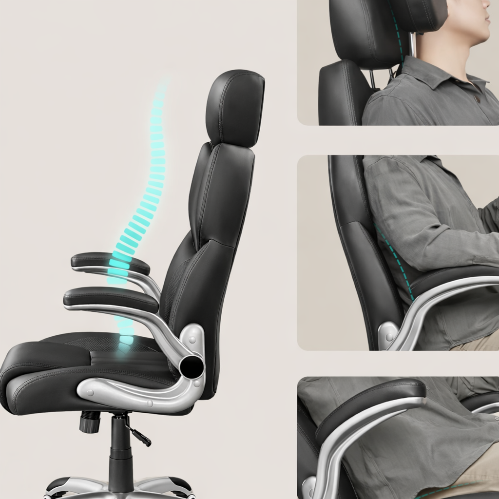 Alege un scaun de birou ergonomic conceput pentru confort zilnic, sustinere corecta si libertate de miscare. Modelul SONGMICS in culoare neagra imbina un design modern cu functii practice precum reglare pe inaltime, suport pentru cap ajustabil si cotiere rabatabile, fiind potrivit atat pentru biroul de acasa, cat si pentru spatiile de lucru profesionale.