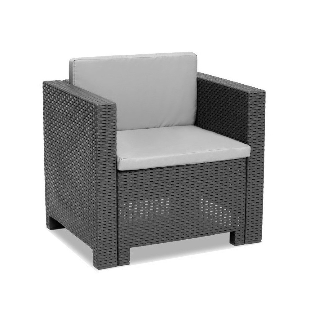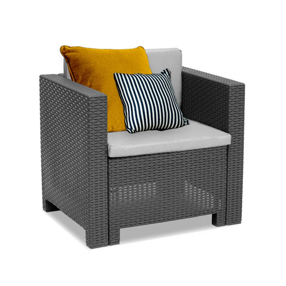 Acest fotoliu de grădină grafit este prevăzut cu perne pentru șezut și spătar, oferind un plus de relaxare în timpul momentelor petrecute afară. Materialul din polipropilenă este ușor de întreținut, rezistent la umezeală și creat pentru a face față razelor solare și condițiilor meteo variate.