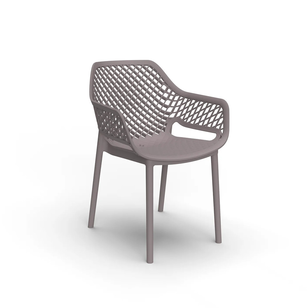 Forma de tip fotoliu, cu brațe integrate, oferă o poziție comodă la masă sau în momentele de relaxare. Construcția monobloc și materialele rezistente contribuie la stabilitate și durabilitate în utilizarea de zi cu zi, iar designul stivuibil ajută la economisirea spațiului atunci când nu este folosit.