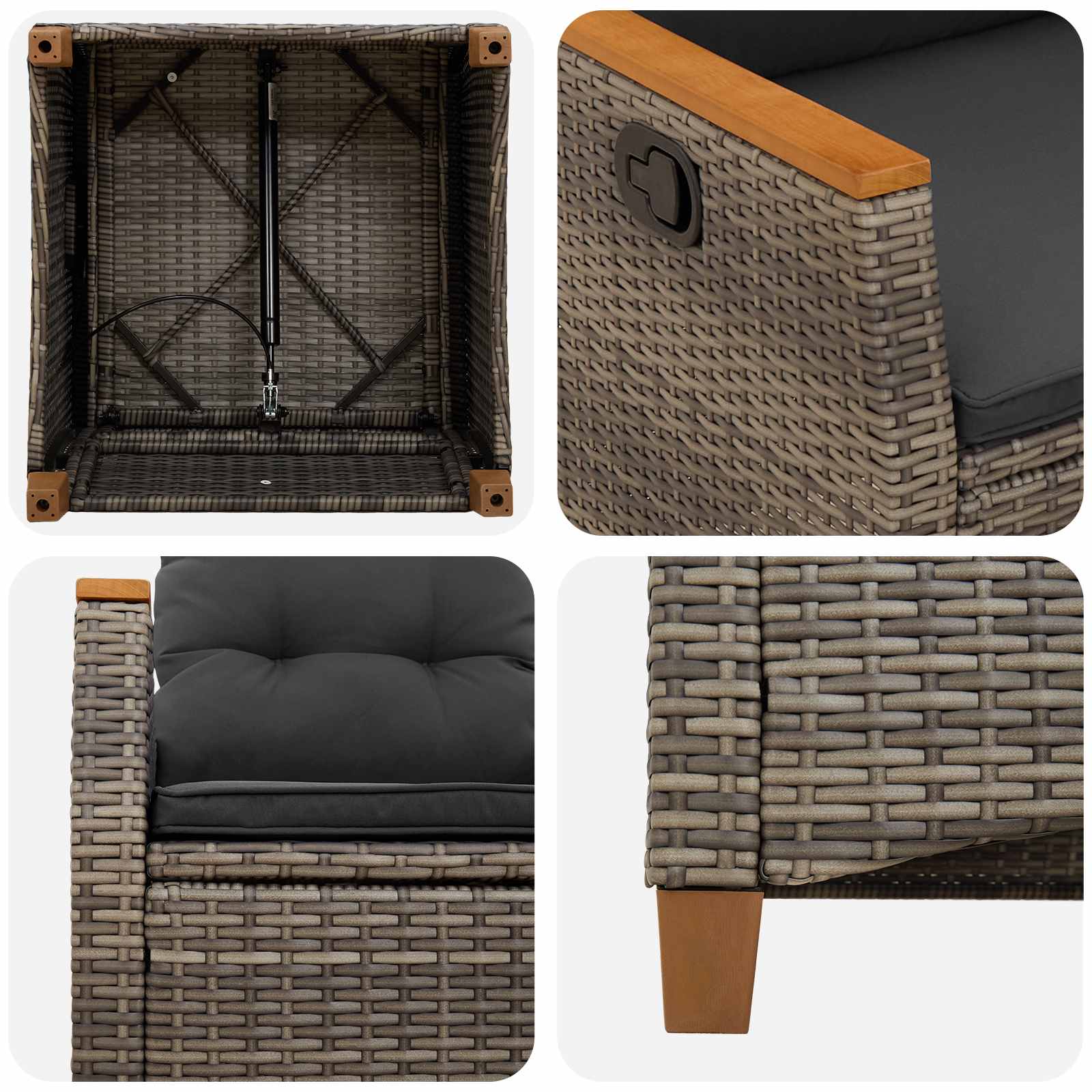 - Spătar reglabil: Îți poți ajusta ușor poziția cu sistemul manual de înclinare, perfect pentru citit, stat la soare sau relaxare. Această funcționalitate îți permite să te bucuri de confort pe măsura nevoilor tale.