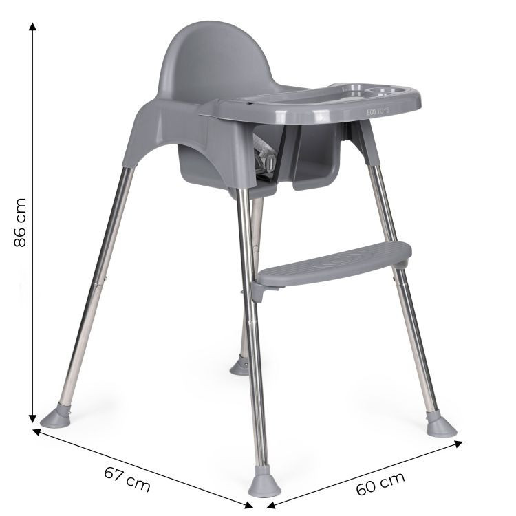 Utilizare: recomandat de la aproximativ 6 luni (când copilul stă stabil în șezut) până la 36 de luni. Pe lângă hrănire, poate fi folosit și ca măsuță pentru activități precum desenul sau jocurile, cu tava montată.