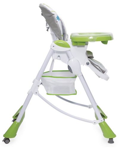 Este un scaun de hrană pentru bebeluși potrivit pentru mesele de acasă, oferind stabilitate, funcționalitate și un design plăcut, în nuanță verde fresh.