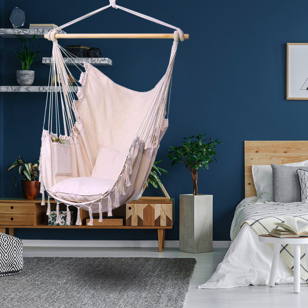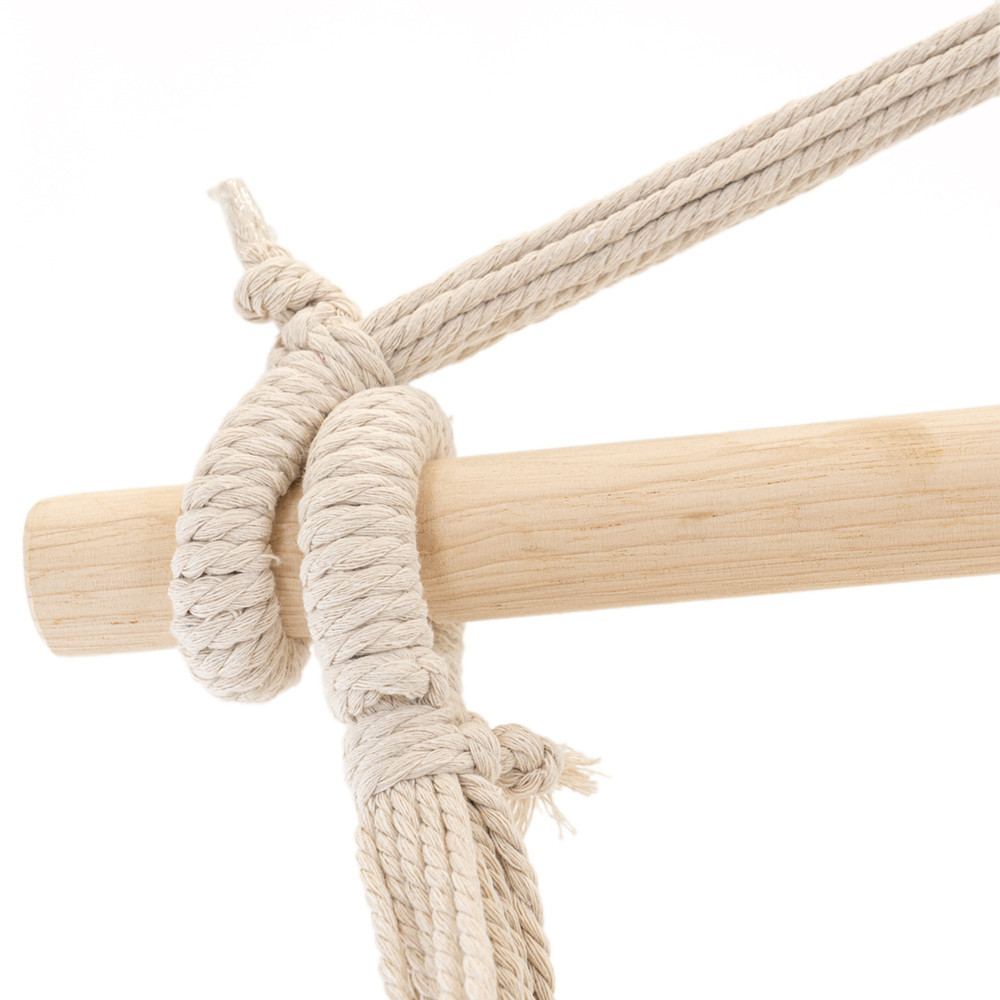 Agata scaunul hamac de o grinda, un suport special sau o ramura solida, apoi ajusteaza inaltimea astfel incat sa intri si sa iesi usor. Este perfect pentru relaxare zilnica, seri pe terasa sau un plus de confort in camera copiilor (sub supraveghere).