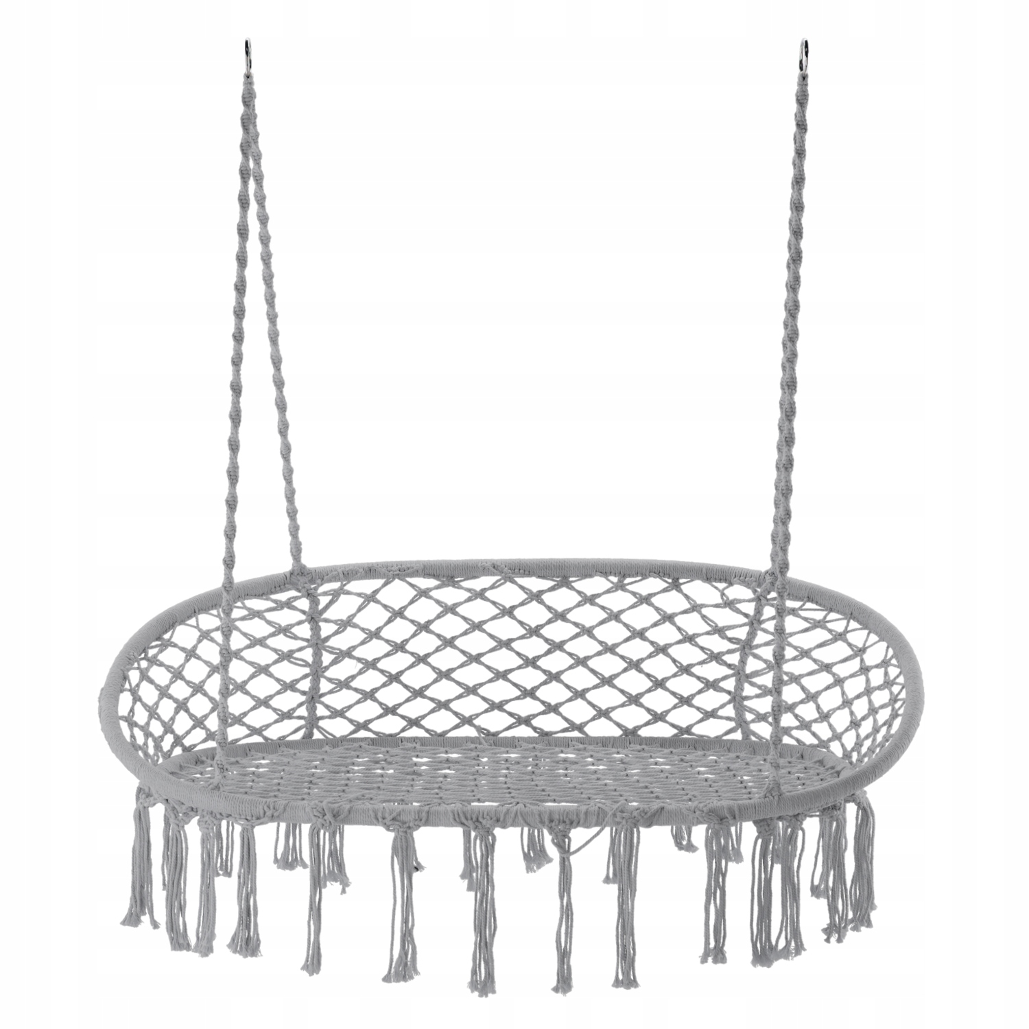 Bucura-te de momente de relaxare in doi cu acest scaun leagan suspendat dublu Sersimo, potrivit atat pentru interior, cat si pentru exterior. Designul sau modern cu franjuri decorative si nuanta gri il transforma intr-o alegere inspirata pentru balcon, terasa, living sau gradina. Structura solida si materialele rezistente ofera confort, stabilitate si durabilitate la utilizare.
