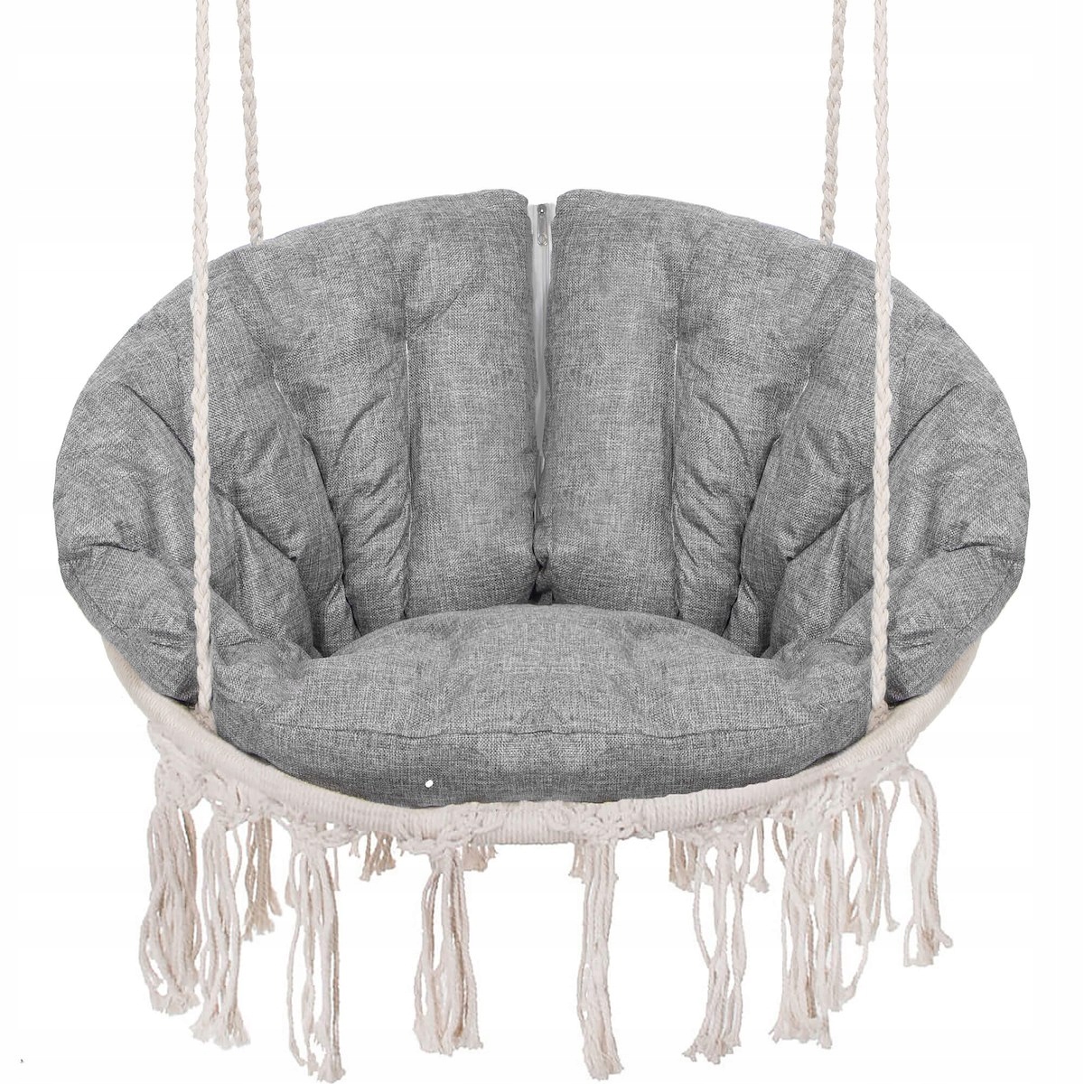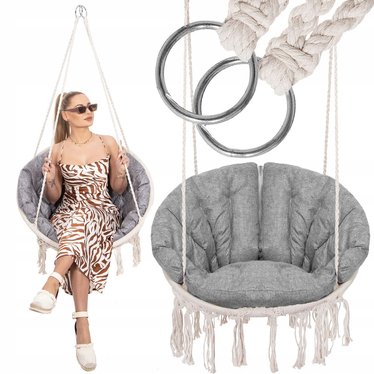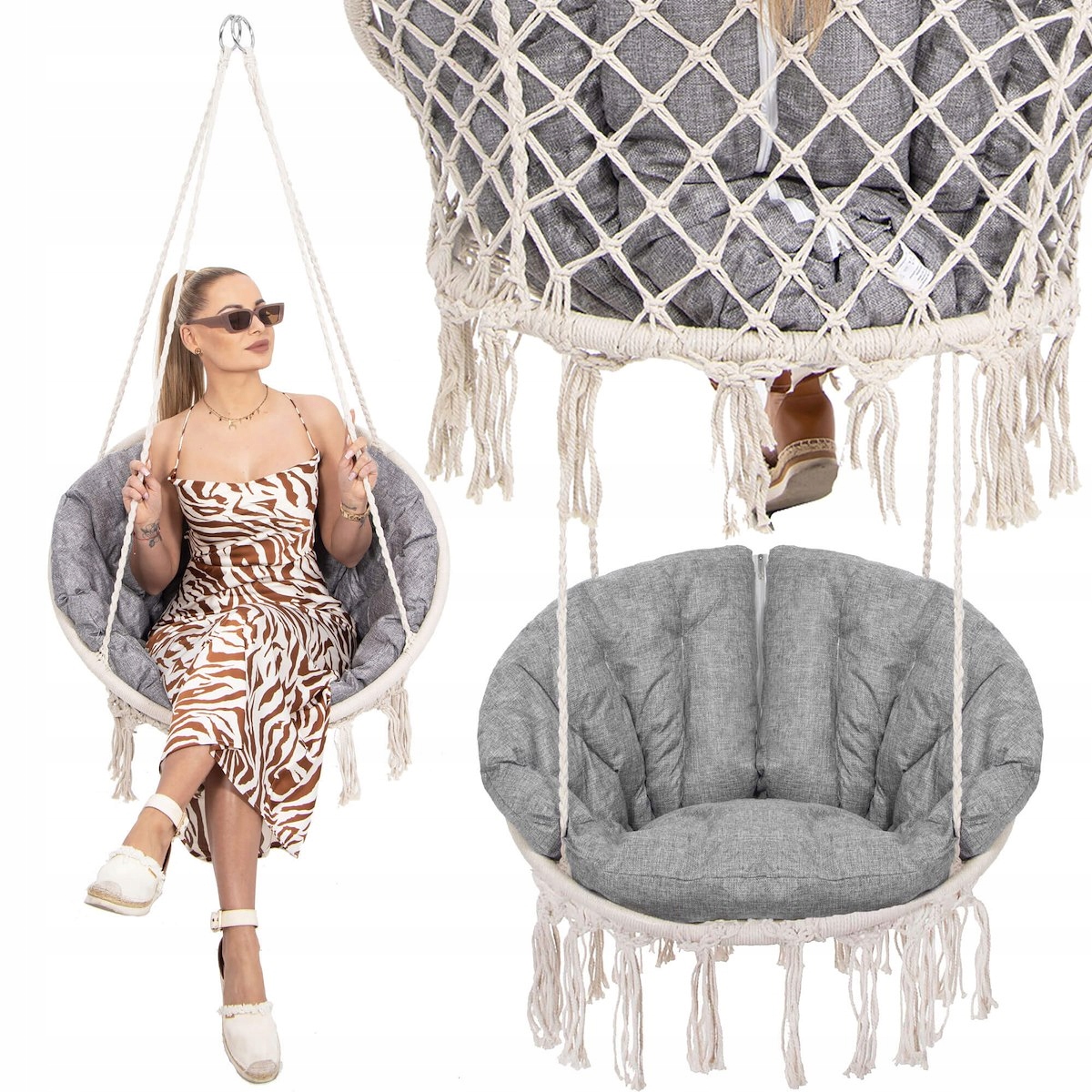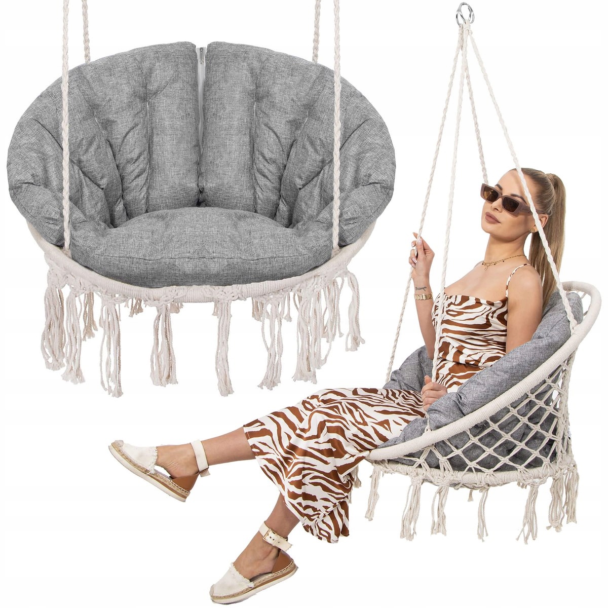 Alege un scaun suspendat rotund care imbina confortul cu un design decorativ modern-boho. Modelul Sersimo Confort Plus este potrivit pentru casa, balcon, terasa sau gradina, oferind un loc relaxant atat pentru adulti, cat si pentru copii. Nuanta bej a structurii si perna gri melange se integreaza usor in amenajari diverse, de la interioare cozy pana la spatii exterioare elegante.