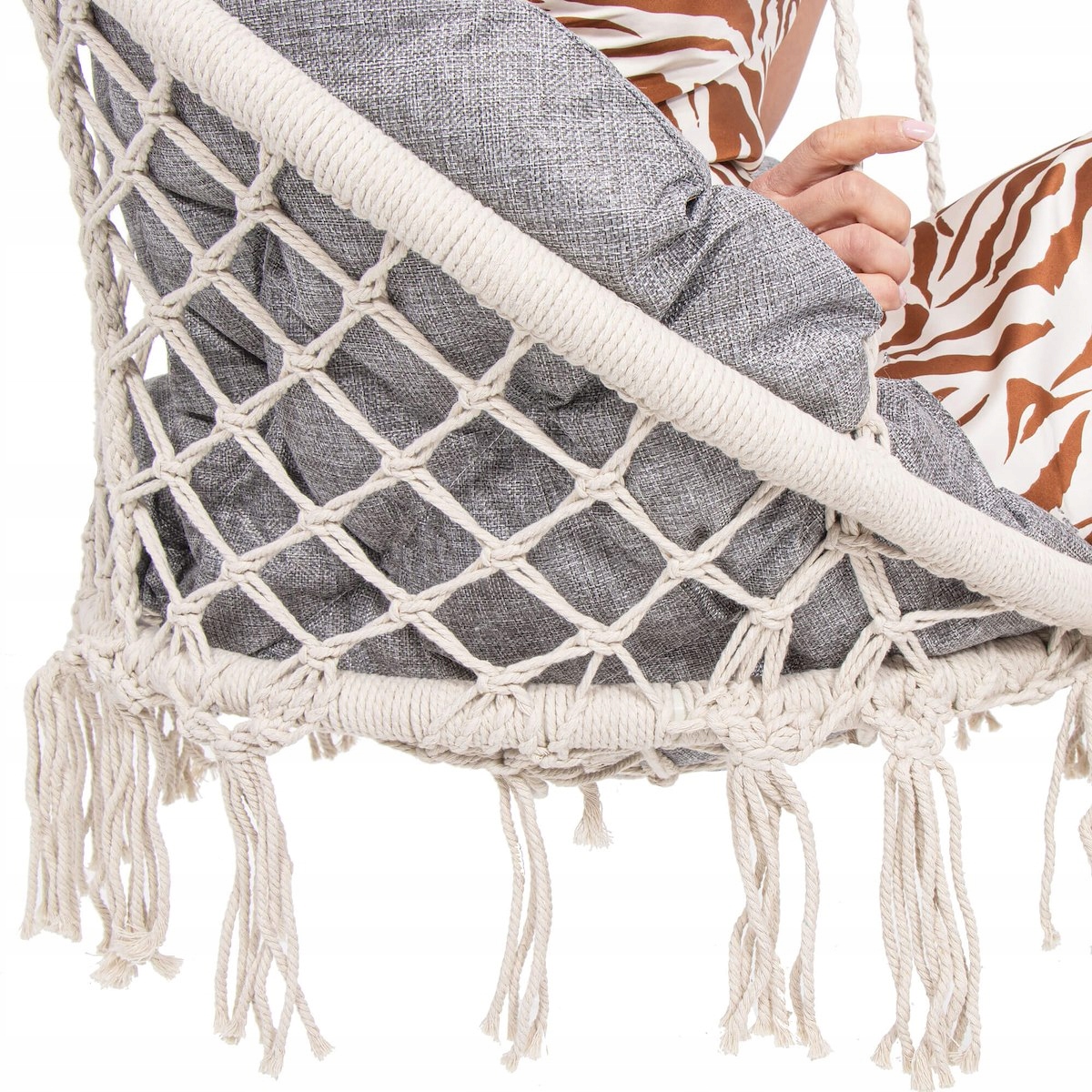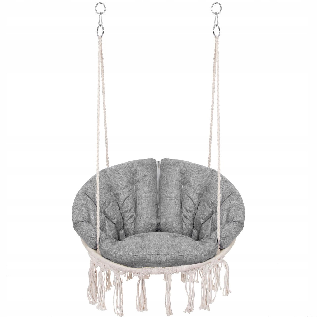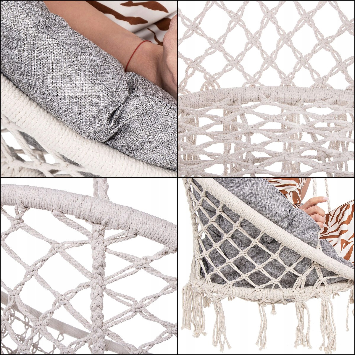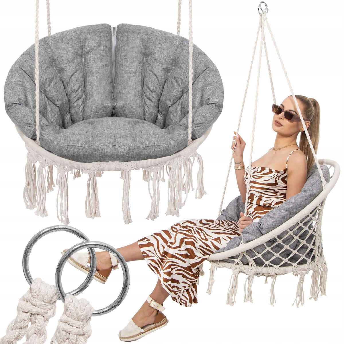 Utilizare: agata scaunul de un suport, tavan sau grinda rezistenta, in functie de spatiul disponibil. Pentru o miscare clasica fata-spate, foloseste doua carlige. Daca iti doresti o balasare libera, cu rotatie ampla, monteaza-l intr-un singur punct de fixare. Este ideal pentru momente de relaxare, citit, odihna sau pentru a crea un colt confortabil in casa ori afara.