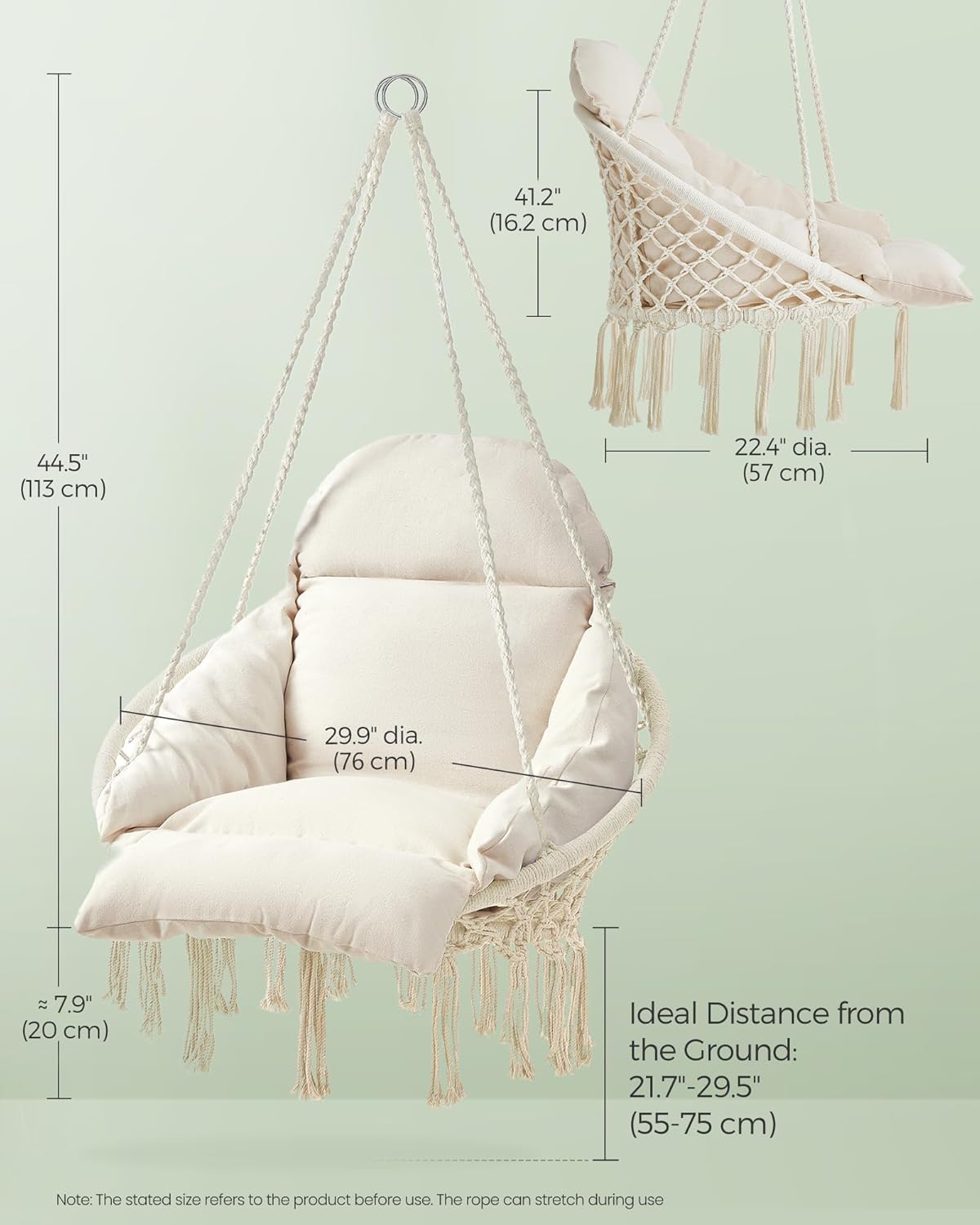 Bucură-te de momente de liniște cu acest scaun suspendat tip hamac SONGMICS, creat pentru relaxare acasă, pe balcon, terasă sau în grădină. Designul său în stil scandinav-boho, în nuanță crem, aduce un plus de eleganță, iar perna groasă oferă susținere confortabilă pentru citit, odihnă sau pur și simplu pentru câteva clipe doar pentru tine.