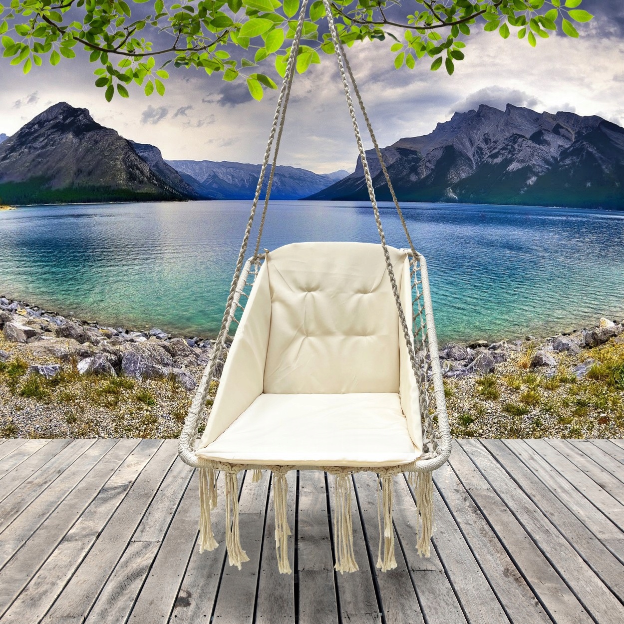 Scaun suspendat tip leagan cu perna pentru casa si gradina, bej, 60x65x115 cm