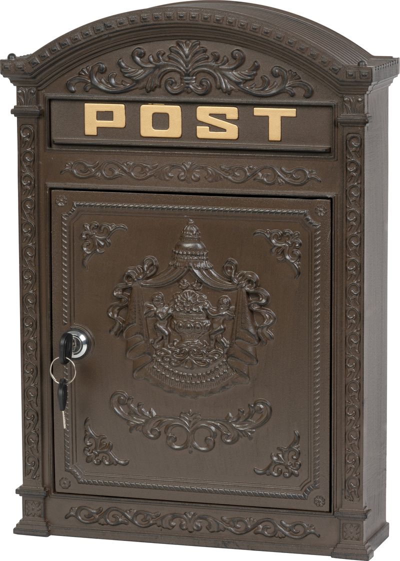 Dekoratívna poštová schránka Edgar v hnedej farbe zaujme klasickým reliéfnym dizajnom s nápisom POST. Je vhodná na umiestnenie pri dome, na plot alebo múr a poskytuje praktický priestor na doručovanie bežnej pošty.