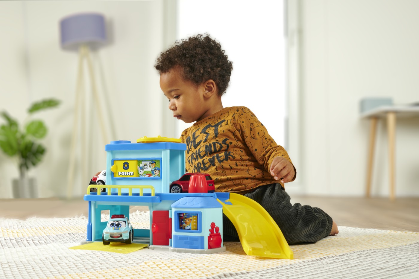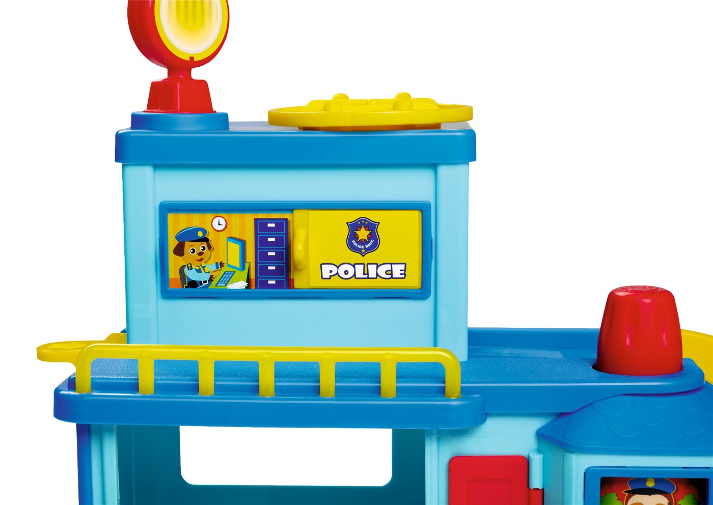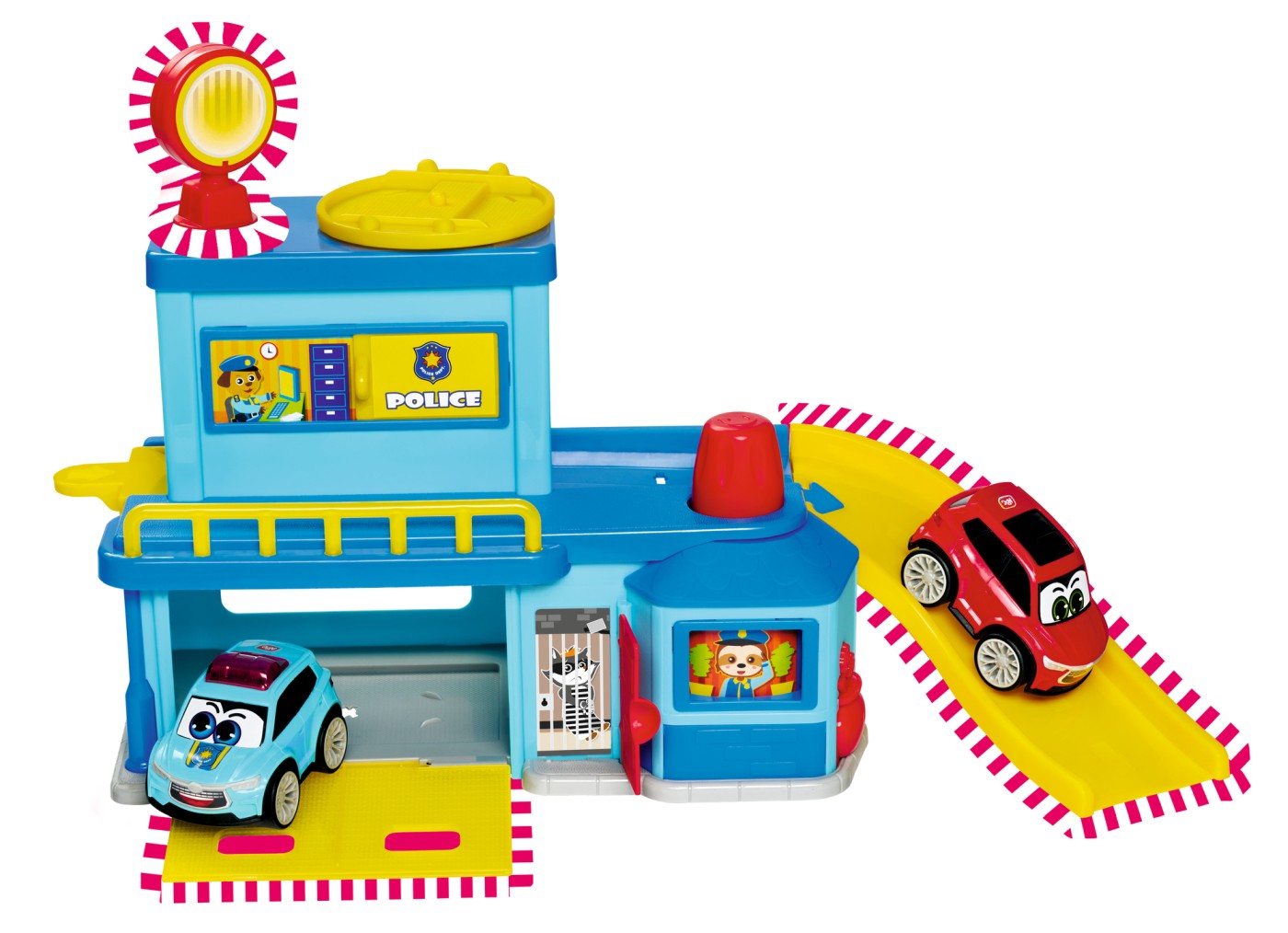 Copiii pot urca masinutele pe platforma, le pot lansa pe rampa si pot inventa rapid misiuni de salvare sau urmariri spectaculoase. Designul colorat si accesoriile mobile fac din aceasta jucarie sectie de politie un set atractiv si usor de folosit.