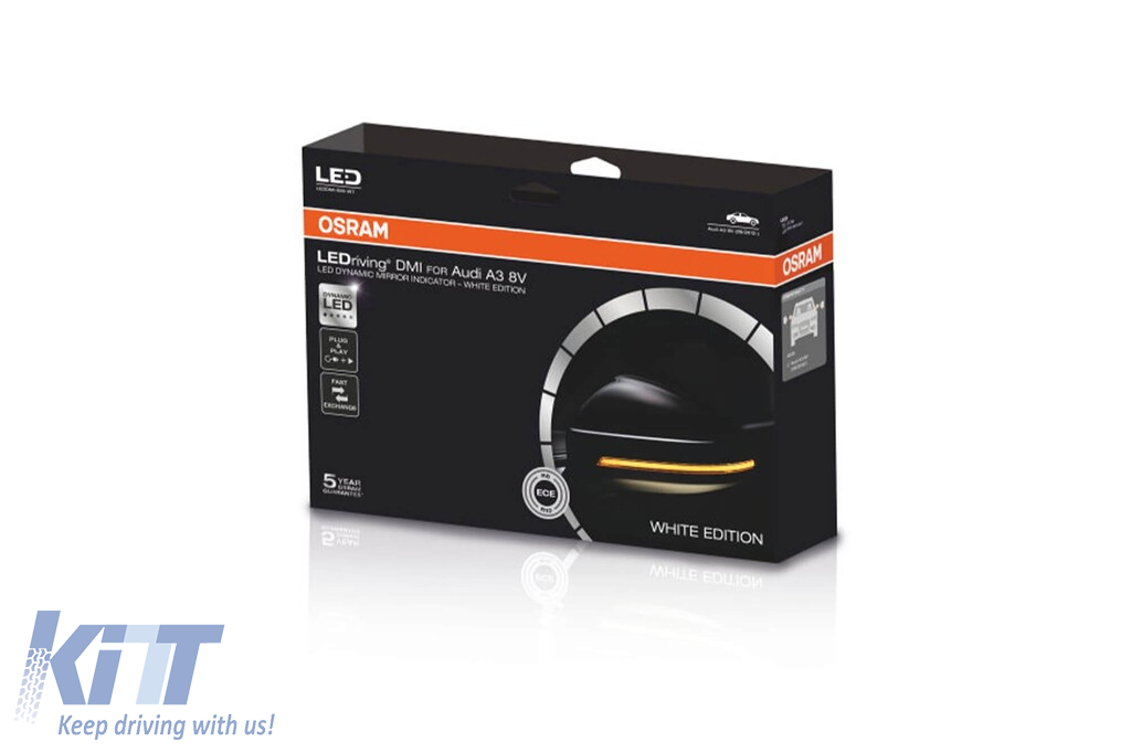 Semnale de întoarcere dinamice Osram pentru oglinzi laterale, fabricate din diode Osram de înaltă calitate din seria Duris S5. Semnalele de întoarcere în mișcare se instalează în locul semnalelor standard de întoarcere din oglinzile laterale fără a fi necesară programarea sau codificarea suplimentară - Plug & Play. Semnalele LED emit o lumină cu 200% mai bună decât semnalul de întoarcere fabricat. Semnalele de întoarcere dinamice Osram sunt certificate ECE conform standardelor R6/R10. Carcasa și sticla au un grad de protecție IP6K9K, ceea ce le face rezistente la apă, praf și șocuri. Osram îmbunătățește calitatea produselor sale conform cerințelor DIN ISO/IEC 17025. Compania dovedește din nou că este un inovator în producția de corpuri de iluminat de înaltă calitate. Acest model de semnale de întoarcere dinamice Osram este potrivit pentru următoarele modele Audi: Informații tehnice: • Greutate: 1.00 • Producător: OSRAM • EAN: 0000126569