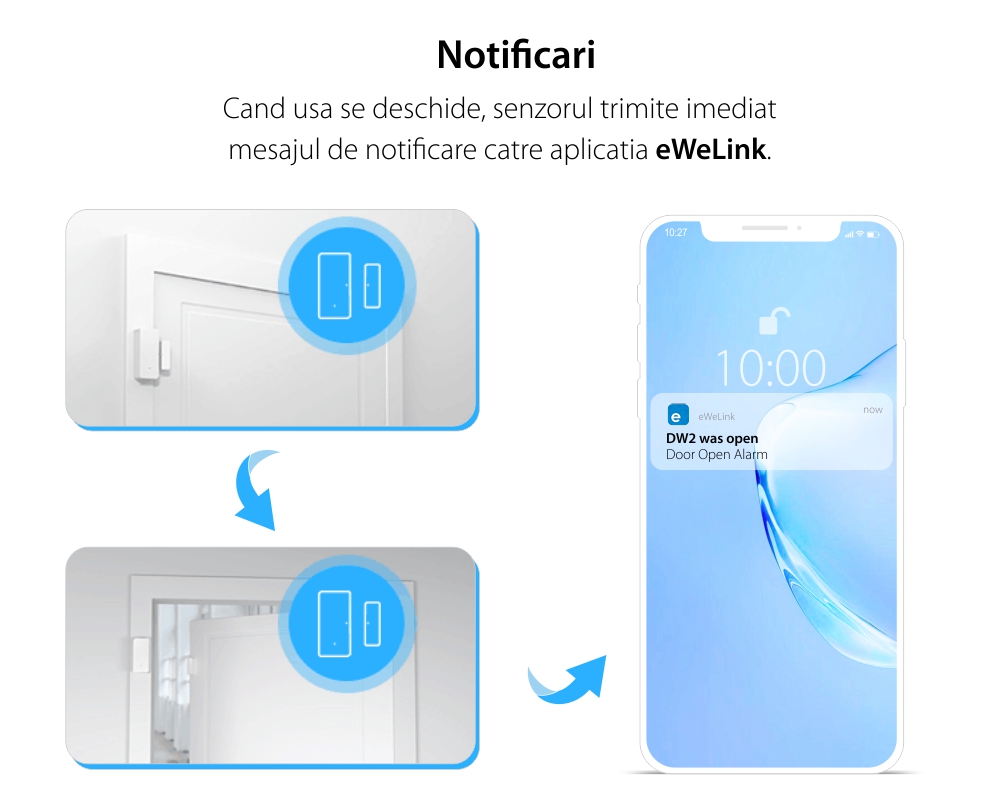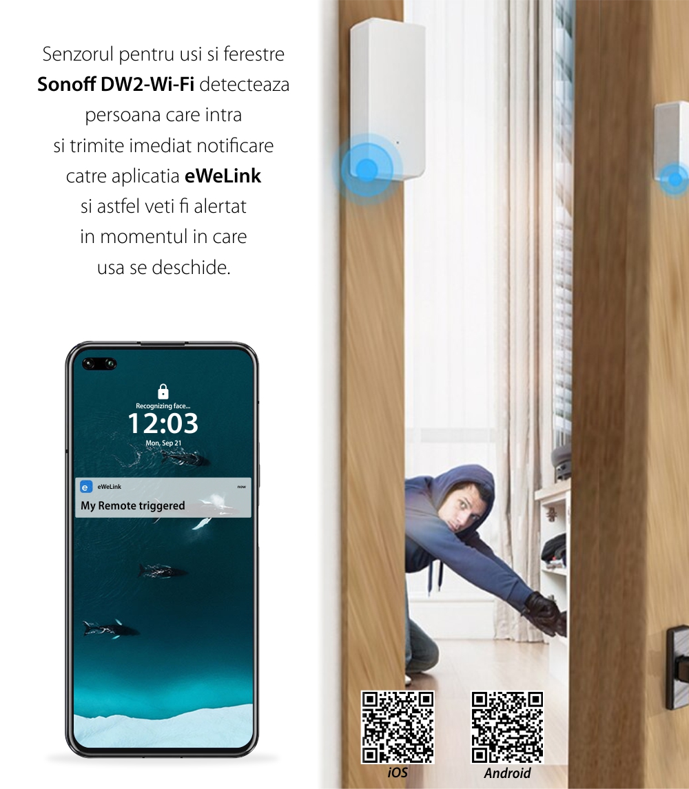 Senzor pentru usi si ferestre Sonoff DW2, Wi-Fi, Notificari si control din aplicatie SmartElectro IntelligentHouse