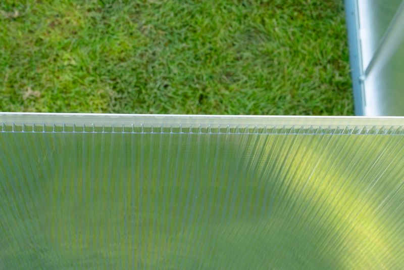 Construcția este realizată pe o bază stabilă și solidă din oțel, iar cadrul din aluminiu cu grosime de 0,8 mm contribuie la rezistență, durabilitate și întreținere ușoară. Materialul din policarbonat este stabilizat UV la exterior, pentru o protecție mai bună împotriva radiațiilor solare și pentru o durată de viață extinsă.