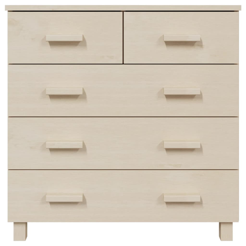 Acest dulap cu sertar este realizat din lemn masiv de pin, ceea ce îl face stabil și robust. Dulapul are 5 sertare cu glisare lină, oferind spațiu amplu de depozitare pentru a vă păstra bine organizate și la îndemână diversele lucruri utile. În plus, blatul robust este perfect pentru a expune obiecte decorative, rame foto și plante în ghiveci.
