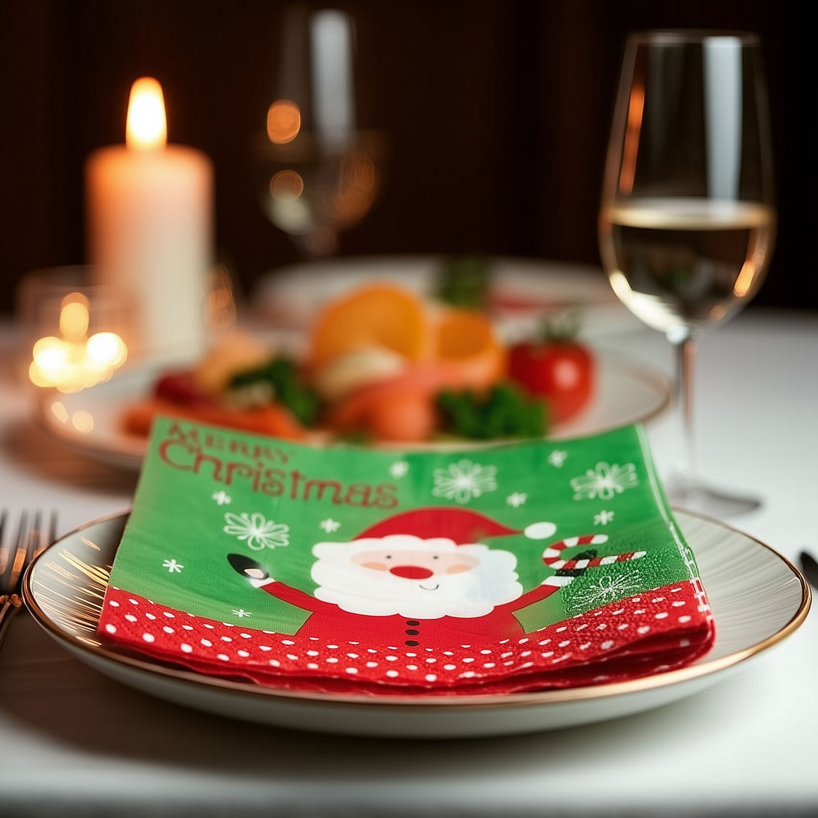 Înveselește masa de sărbătoare cu acest set de șervețele decorative din hârtie, ilustrate cu un simpatic Moș! Aceste șervețele nu doar completează decorul mesei, ci sunt și practice pentru servirea preparatelor, prăjiturilor sau băuturilor.