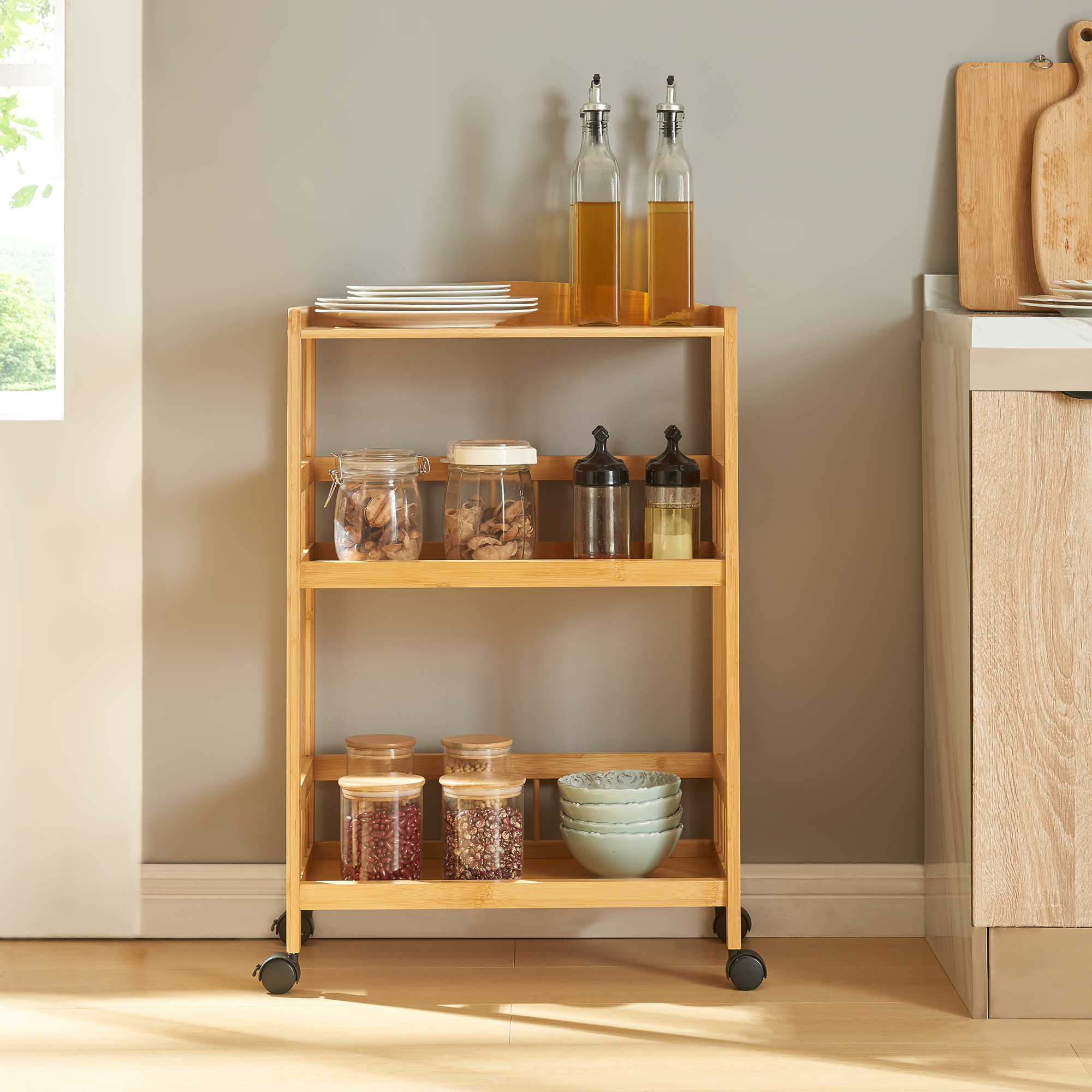 Die drei Ablagen bieten ausreichend Platz für Geschirr, Getränke, Snacks oder andere Gegenstände, die Sie griffbereit haben möchten.
